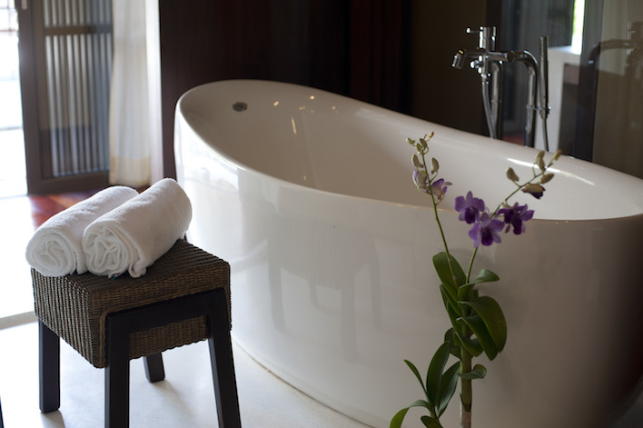 There are three connecting swimming pools at Villa Akatsuki: the largest is a long rectangular infinity pool, situated on the beachside with the sweeping views of Koh Samui’s west coast. This is perfect for cooling off, doing serious swimming or just playing about. For the little ones, there is a shallow children’s pool located near the sala. Lastly, there is the reflecting pool: a true work of art. The undisturbed waters of the reflecting pool provide a stunning watery mirror reflecting the sky and features above. Right next to the pool are four reflective bronzed tanning beds, perfect for soaking up the sun and ergonomically shaped for optimal comfort. The pool area is absolutely an incredible place to relax.