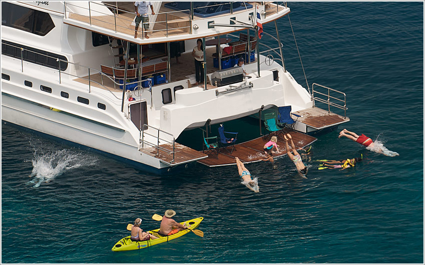 This 70 feet catamaran can host 50 people during the day and can allow 16 individuals in 6 cabins to sleep during night trips. The boat can take its crew to a sandy beach that is far from other charter routes. You can have the possibility to enjoy beach dining, barbequing, taking pictures and sunset drinks. You can also play frisbee, badminton, volleyball and football. With kayaks, you can explore small islands, mangroves and caves.