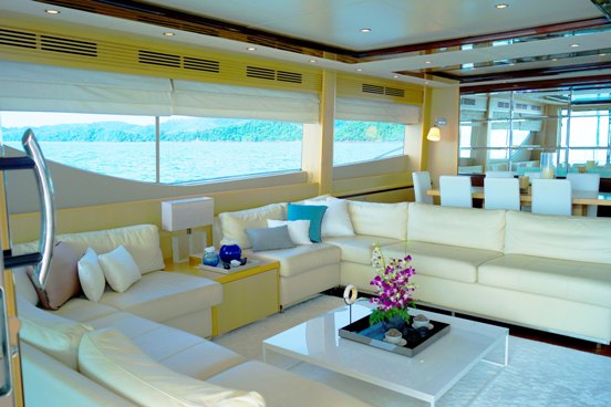 The 23 meters long boat can accommodate 8 individuals. All guests can benefit from the following features: great seating options, wet bar, adjustable headrest sunbathing cushions, a large teak dining table on the aft deck, a hydraulic swimming platform, underwater lights and many others. The saloon has panoramic windows and a lounge. Every accommodation has air conditioning handlers.