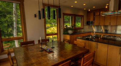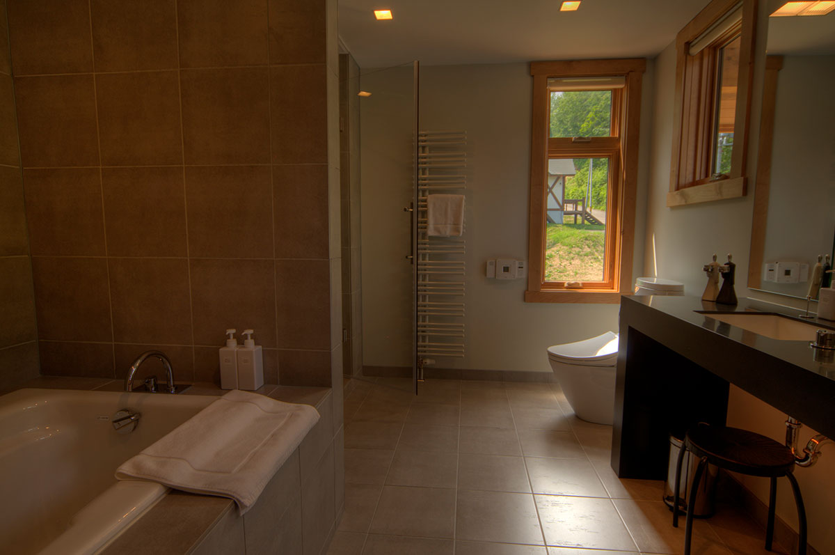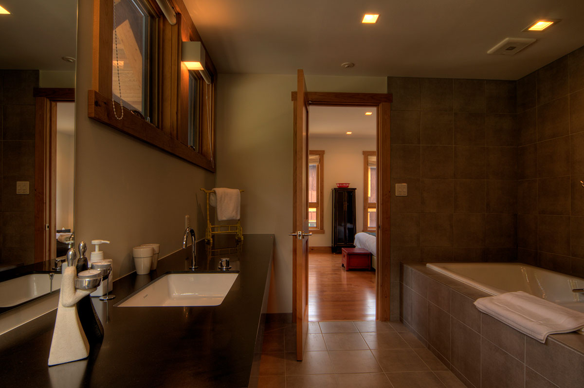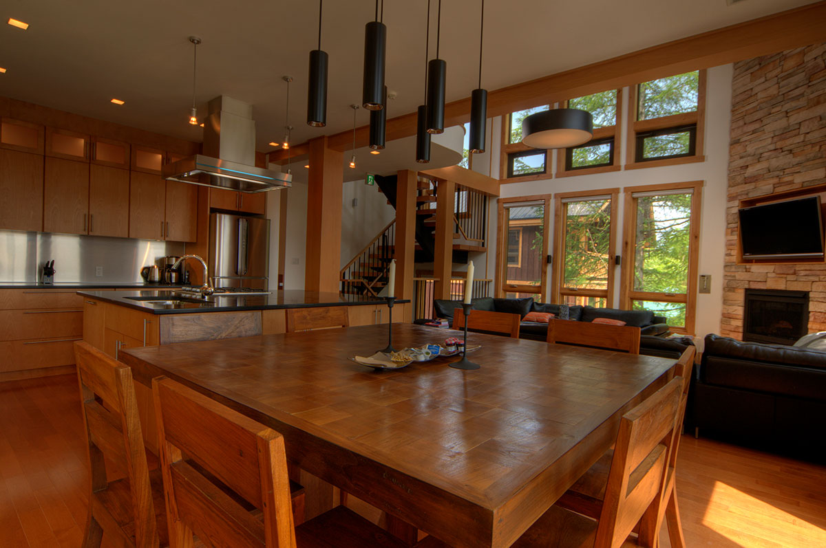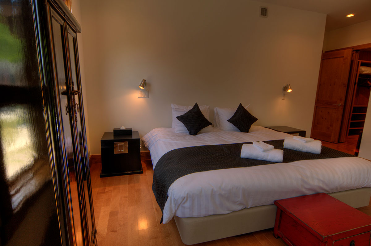 After a long tiresome day on the mountain or skiing, visitors can ease away the pains by enjoying a private 6-person invigorating sauna before retiring to the spacious open plan living and dining areas for a sumptuous delicacy. A spacious and expansive kitchen and dining area open up to a lovely double-height living space that sports a cedar-lined ceiling and a cultured fireplace. The kitchen and dining space is accentuated with beautifully appointed quartz counters, while the bathrooms and washrooms have exquisite Duravit sinks and tubs.