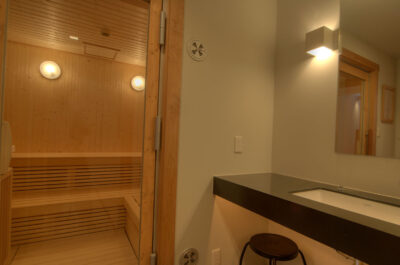 Guest Bedroom 1 — King size bed or 2 single beds; Closet; Central heating; Separate bathroom with sauna for 6 persons + shower, vanity, and separate Japanese toilet + vanity; Toiletries; Hairdryer; Slippers