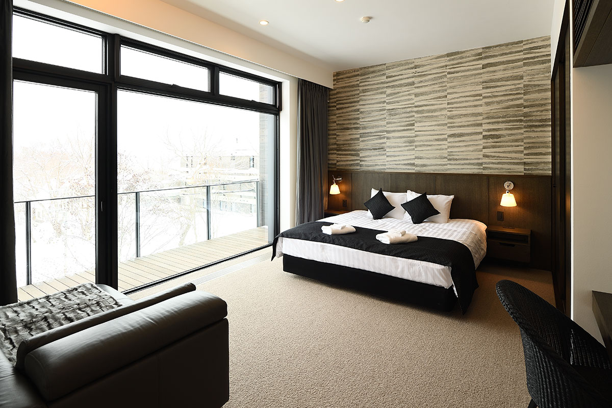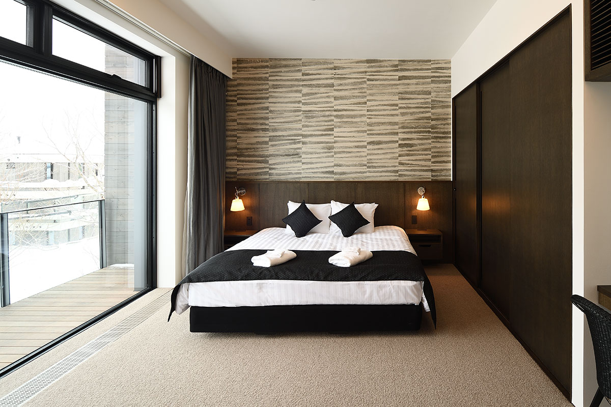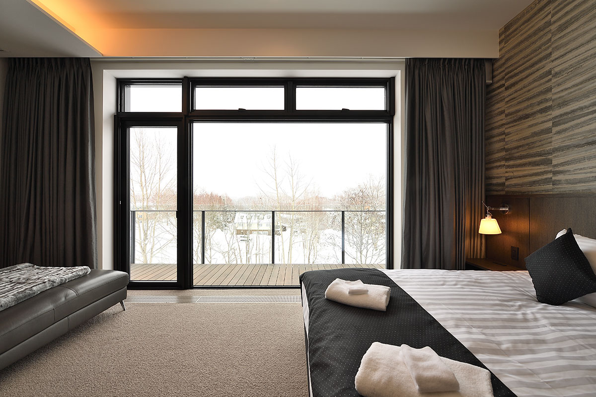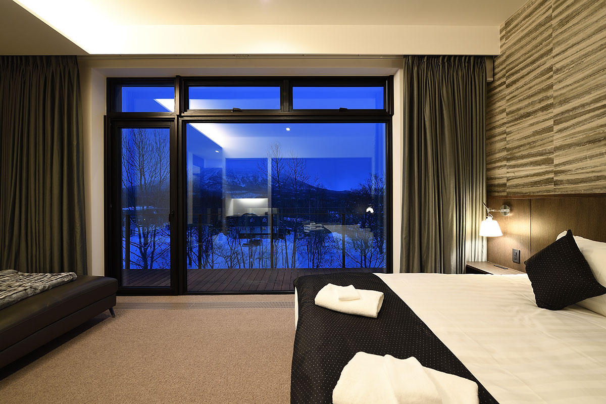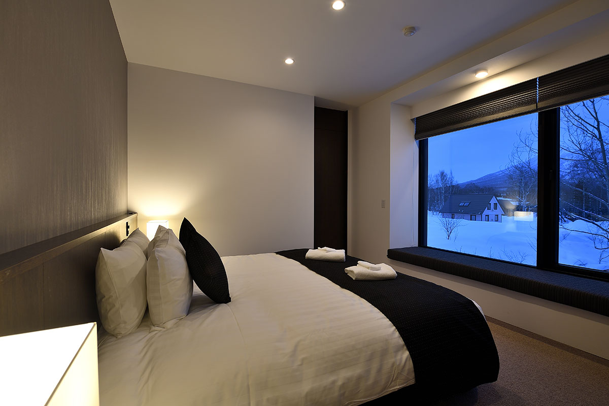 Master Bedroom 1 (21 sqm) — King size bed; Mount Yotei & forest View; Balcony; Closet; Working desk; One seating sofa; Air conditioning & central heating; Ensuite bathroom with double shower, vanity, Japanese toilet; Toiletries; Hairdryer; Slippers