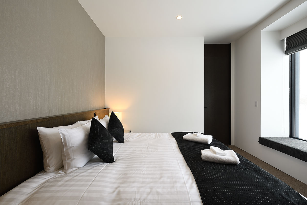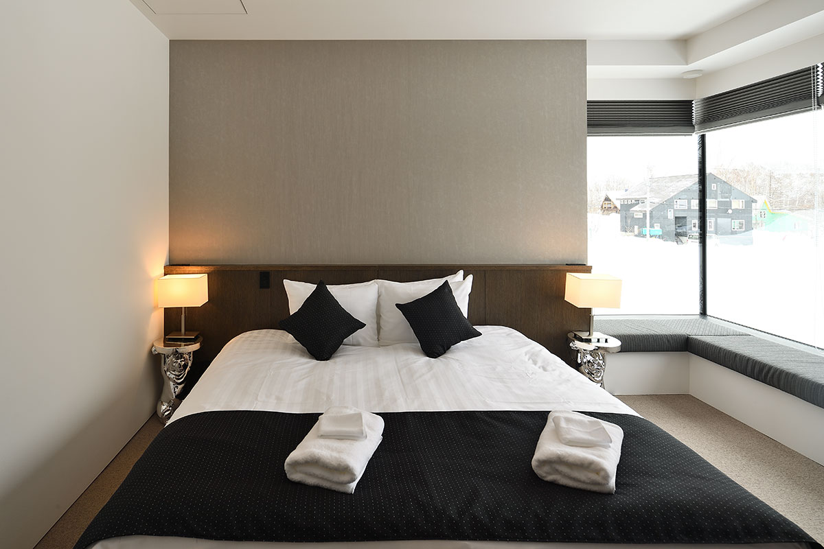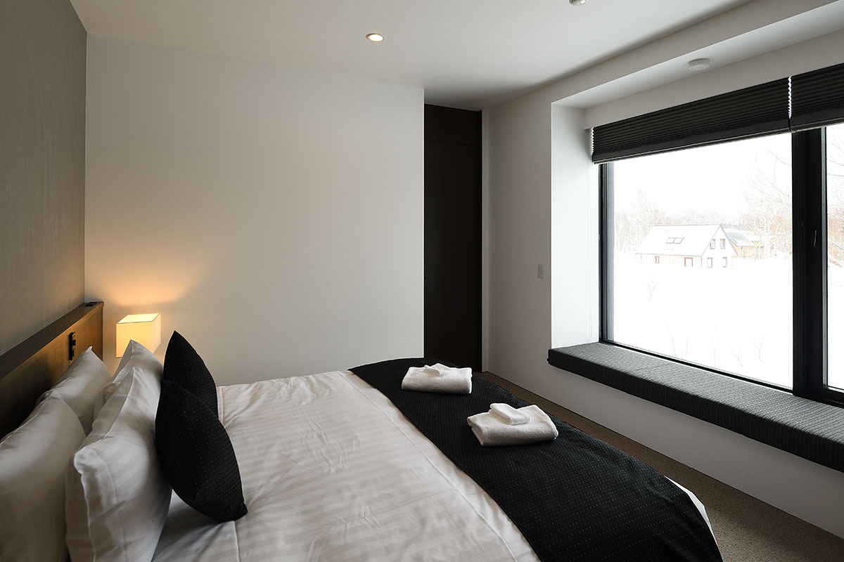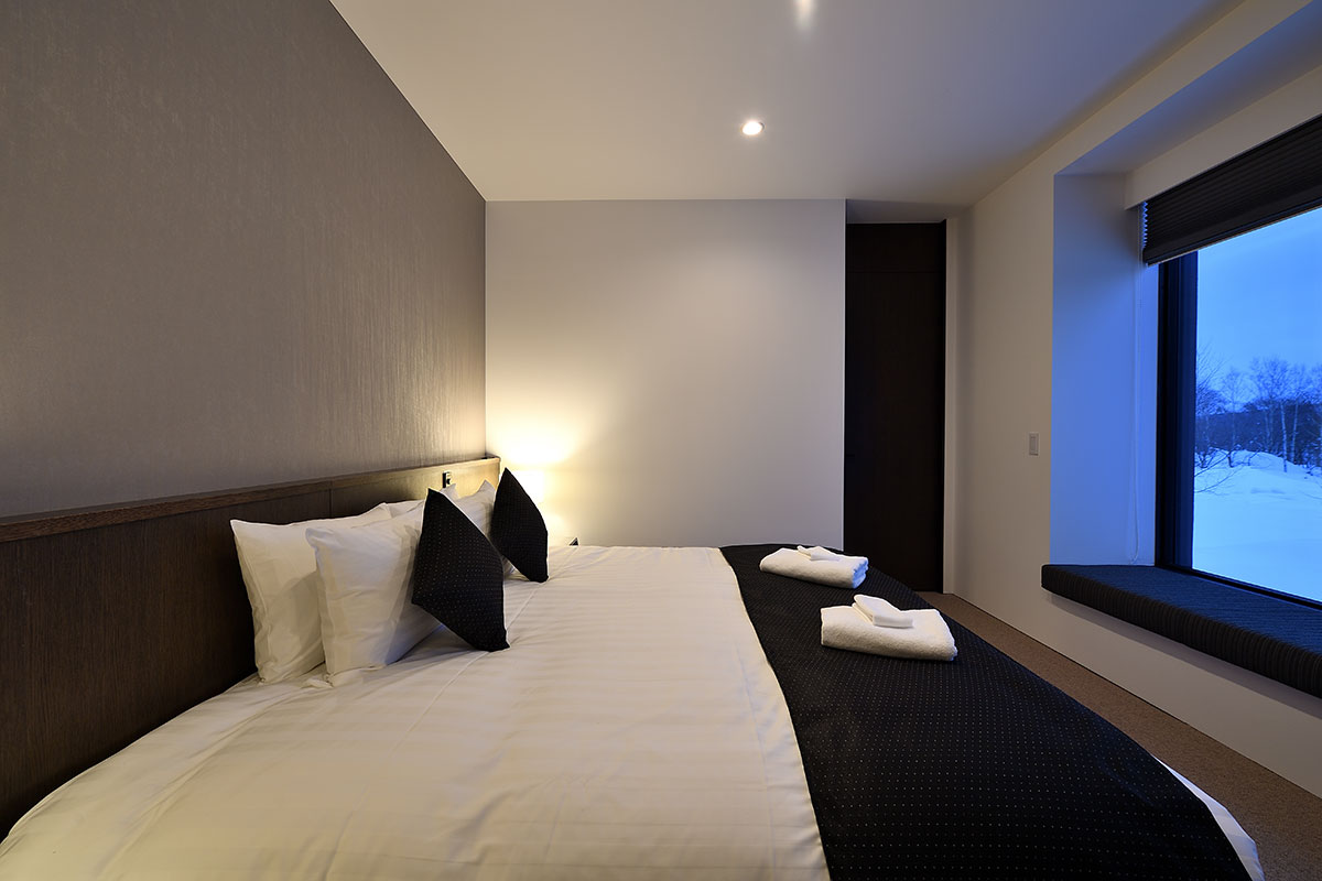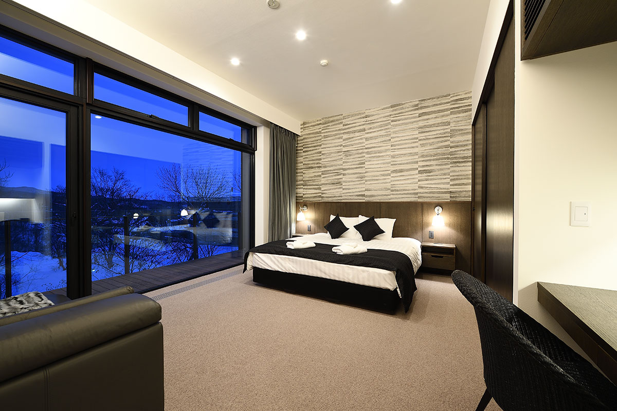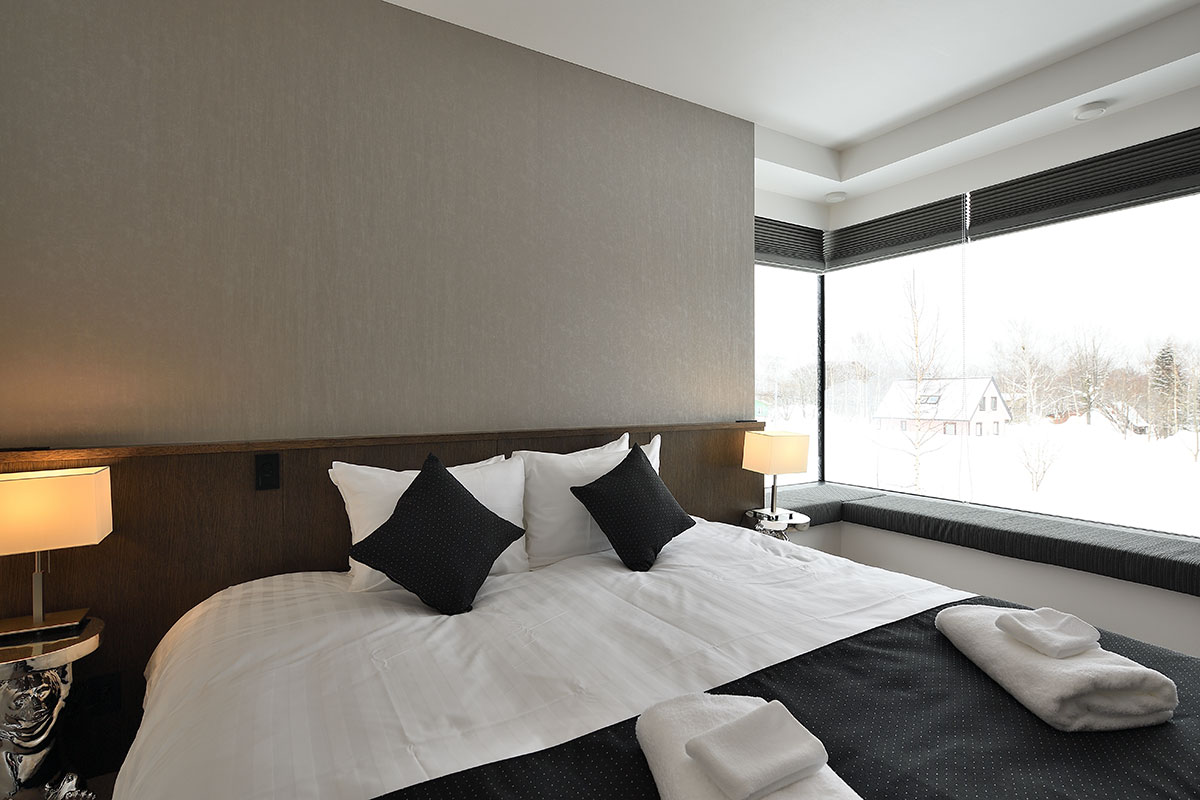 Master Bedroom 1 (21 sqm) — King size bed; Mount Yotei & forest View; Balcony; Closet; Working desk; One seating sofa; Air conditioning & central heating; Ensuite bathroom with double shower, vanity, Japanese toilet; Toiletries; Hairdryer; Slippers