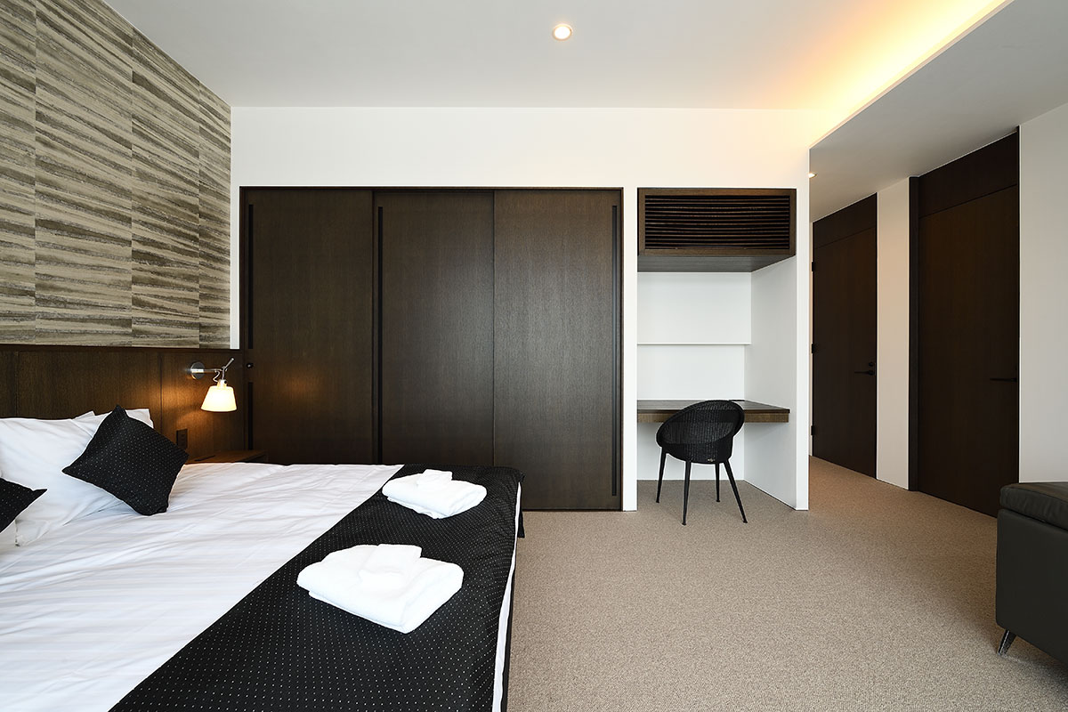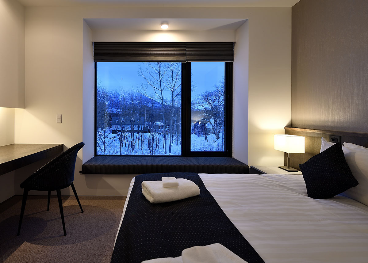 Guest Bedroom 3 (15 sqm) — King size bed or 2 single beds; Mount Yotei & forest view; Closet; Working desk; Central heating; Ensuite bathroom with shower, vanity, and Japanese toilet; Toiletries; Hairdryer; Slippers