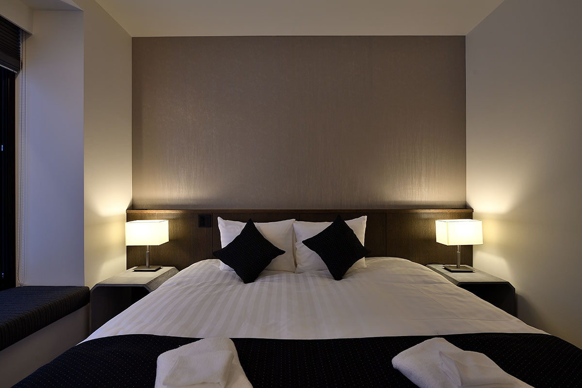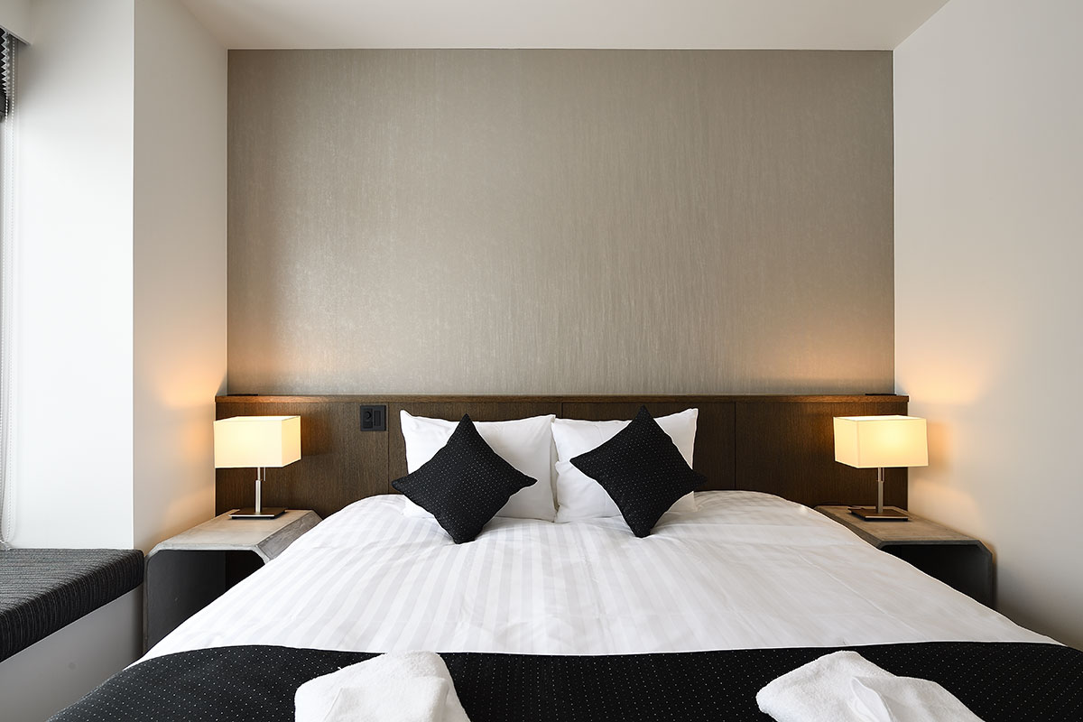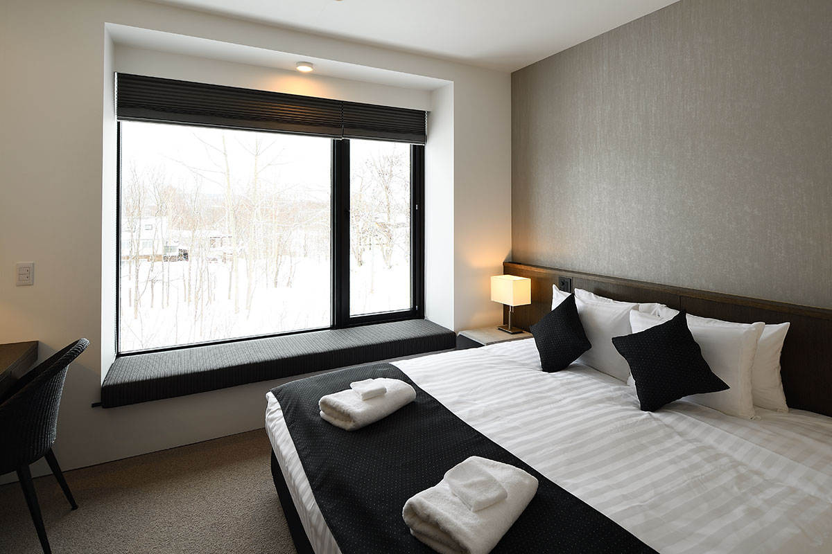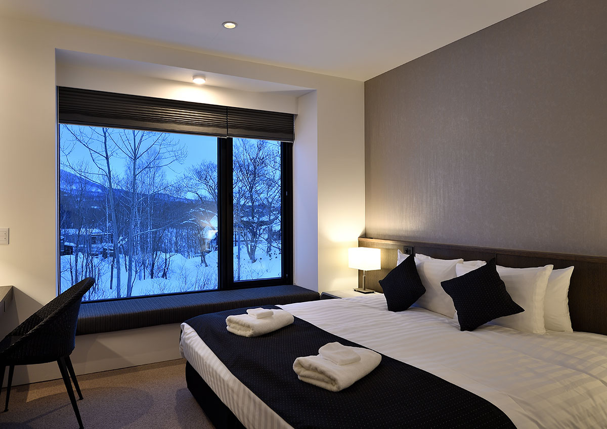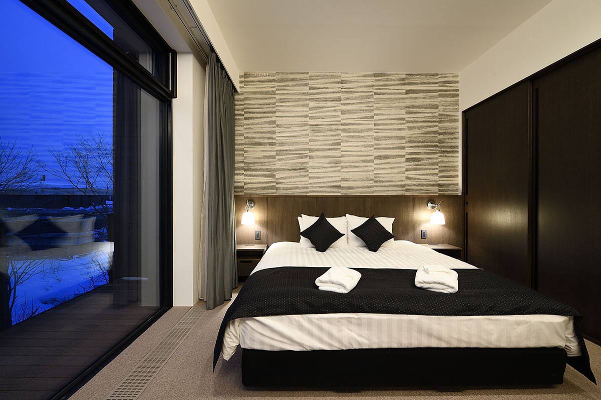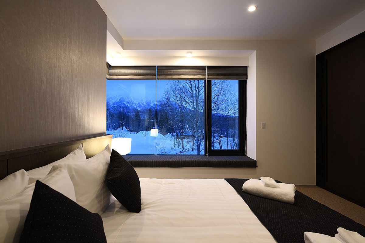 Guest Bedroom 1 (16 sqm) — King size bed or 2 single beds; Mount Yotei & forest view; Closet; Central heating; Ensuite bathroom with shower, vanity, and Japanese toilet; Toiletries; Hairdryer; Slippers