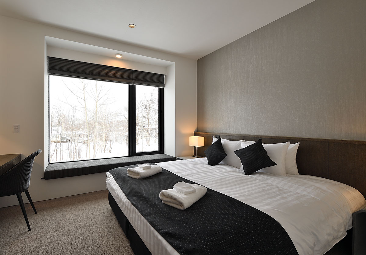 Guest Bedroom 2 (14 sqm) — King size bed or 2 single beds; Mount Yotei & forest view; Closet; Central heating; Ensuite bathroom with shower, vanity, and Japanese toilet; Toiletries; Hairdryer; Slippers