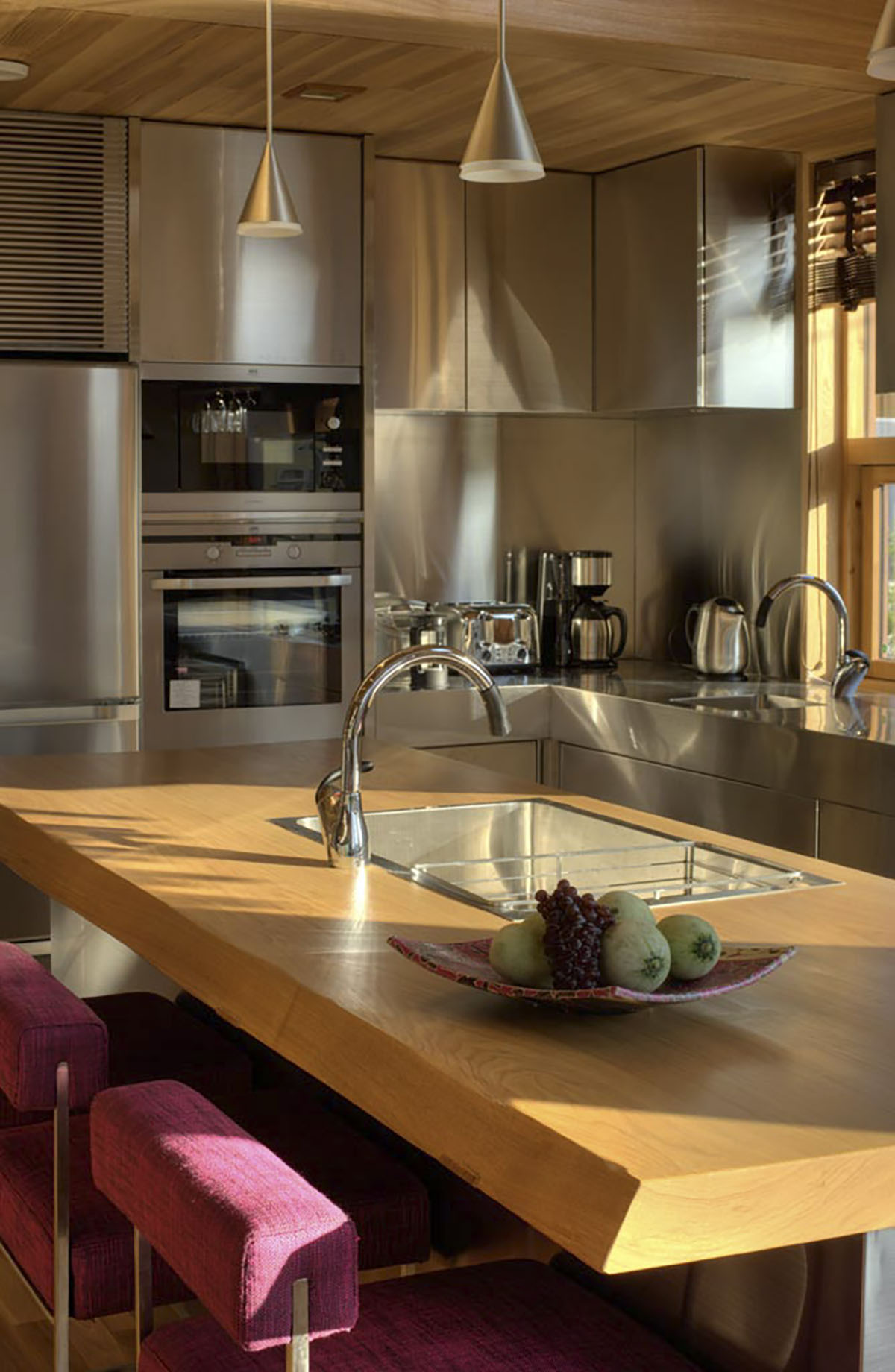 The second level also grants access to two balconies, allowing guests to enjoy the breathtaking views. The kitchen features a generous island bench with individual lighting, a sink, stainless steel covered bench-top housing a gas-burning cooktop, overhead cabinets, and window-side seating for three.