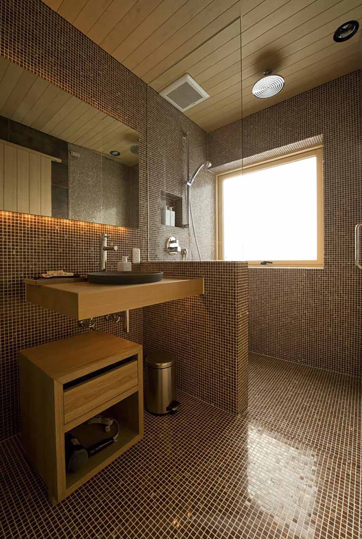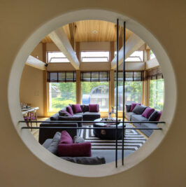 Guest Bedroom 3 – King bed or 2 single beds; Closet space; Round window framing; Ensuite bathroom with Japanese hinoki bath, shower, dual sinks, and toilet; Toiletries; Slippers