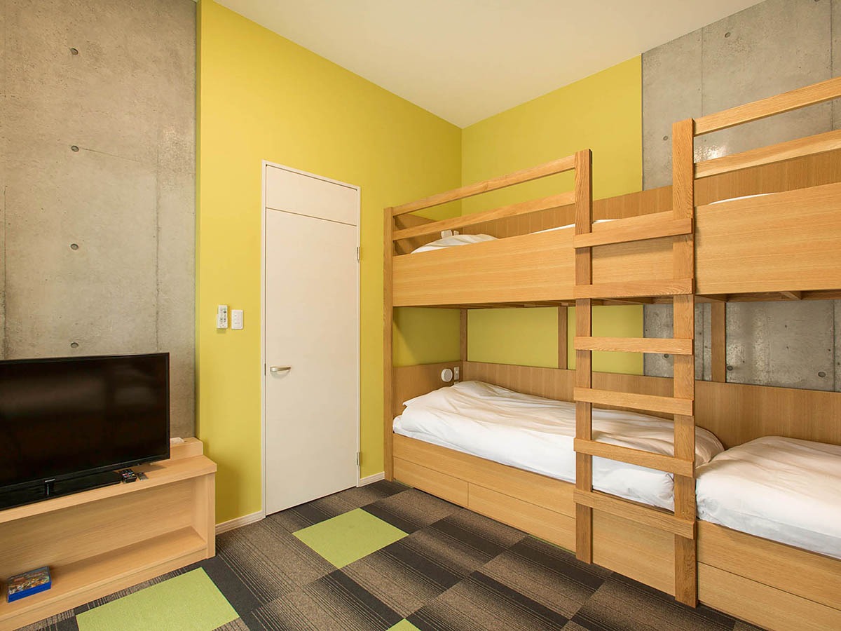 Guest Bedroom 2 — 3 single bunk beds; Media console; Closet; Shared bathroom with shower, vanity, toilet; Toiletries; Hairdryer