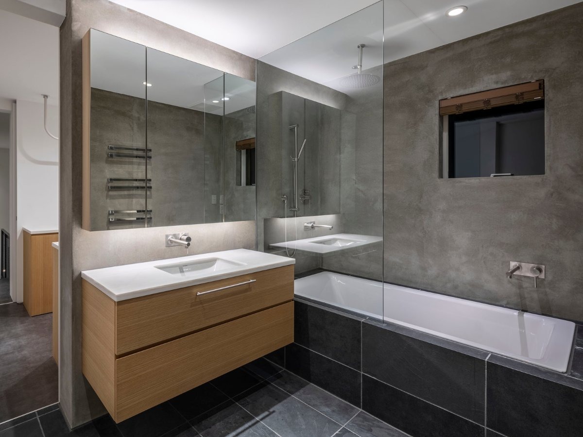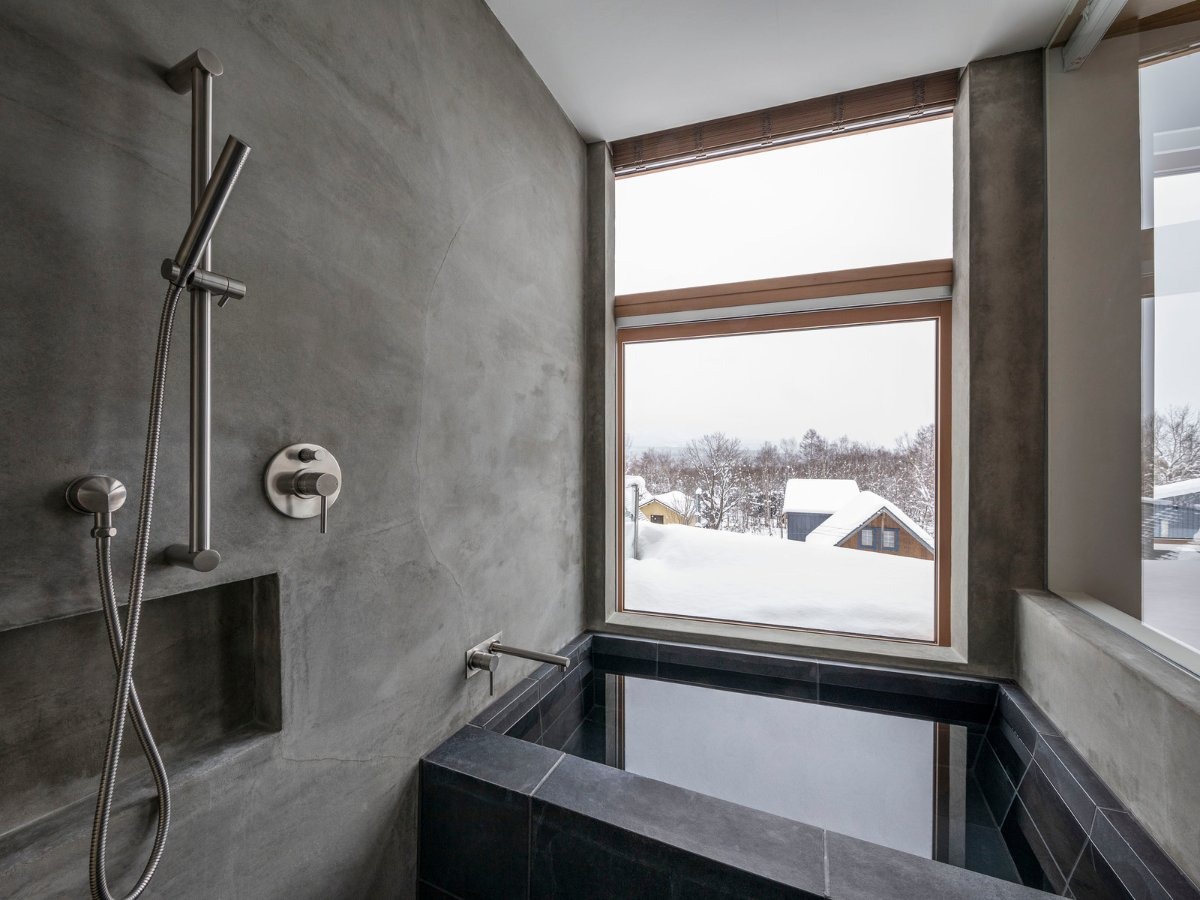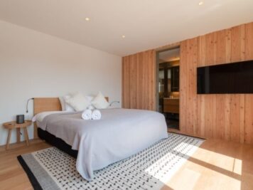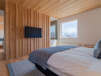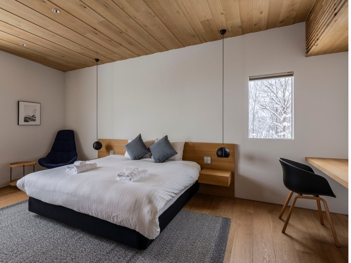 - Master Bedroom B (31 sqm) — King size Bed or 2 Single Beds; Walk-in wardrobe; Full-length mirror; Individual panel heating; Smart TV; Single designer lounge chair; Small coffee table; Desk with desk lamp; Bedside tables; Ensuite with Japanese-style bath and Mount Yotei view, shower, double vanities, toilet