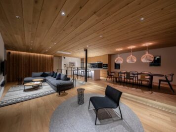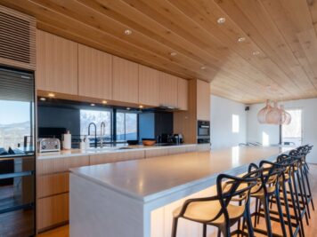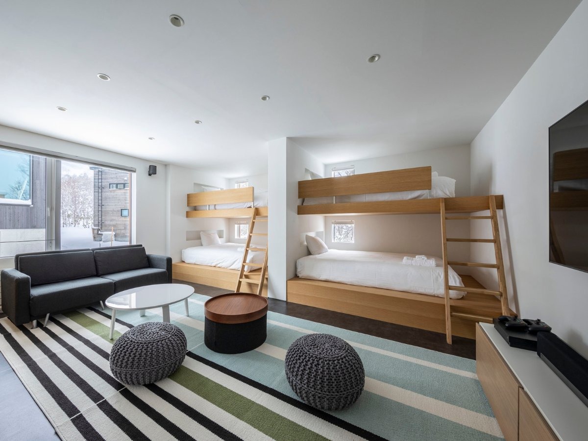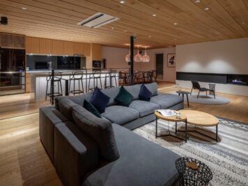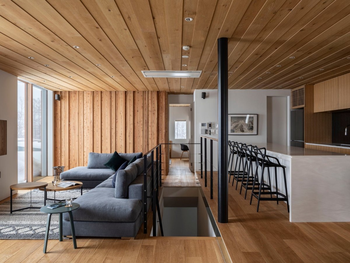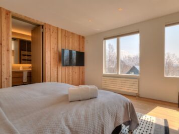 With its contemporary aesthetic and expansive floor-to-ceiling windows, it blends flawlessly with the surrounding countryside. Just a short distance from the ski slopes, this private haven offers a warm and pleasant spacious living space with a gas fireplace that invites you to relax and enjoy the warmth. It also has five exquisitely furnished bedrooms including the bunk room that kids will especially like, accompanied by three ensuite bathrooms, as they have the feel of luxury retreats.