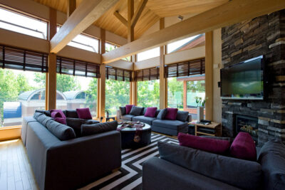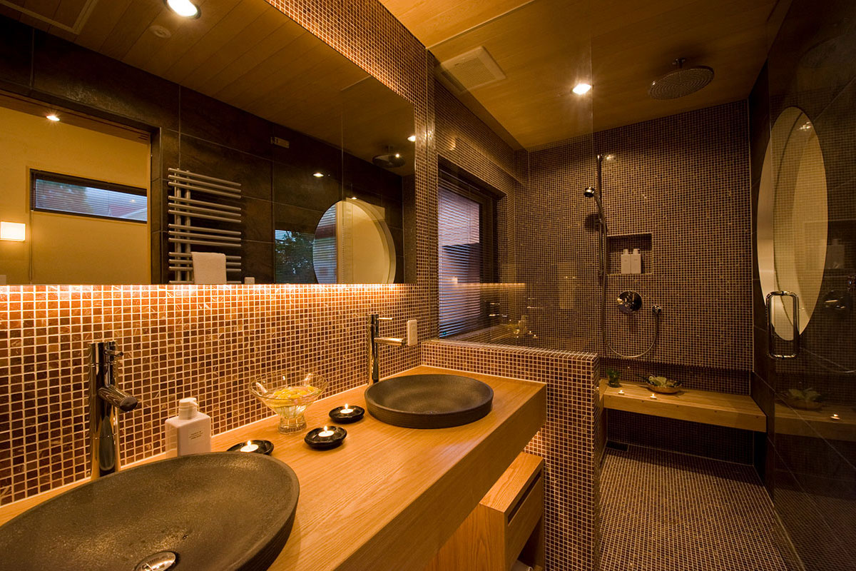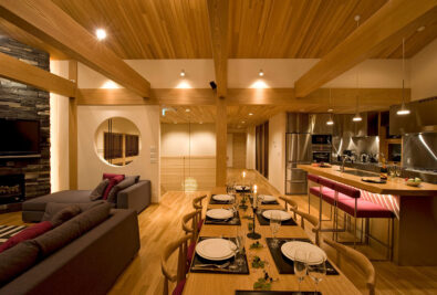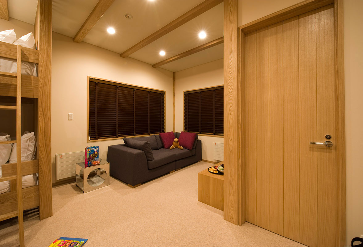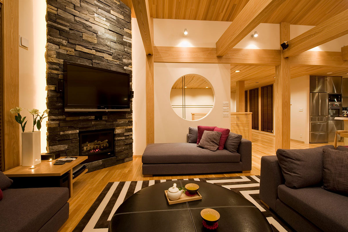 The interiors of the chalet are dominated by rich wooden features of light natural tones instantly embracing guests with the familiar feel of homeyness. Exposed timber beams and extra high vaulted ceilings give the space a distinct cabin-style aesthetic. A stone brick wall panel accentuates that chalet’s fireplace and well-selected furniture further fill the room with a sense of nostalgic comfort. Iconic Japanese features are also evident including bamboo-inspired trellis dividers and a ‘Satori no Mado’ window.