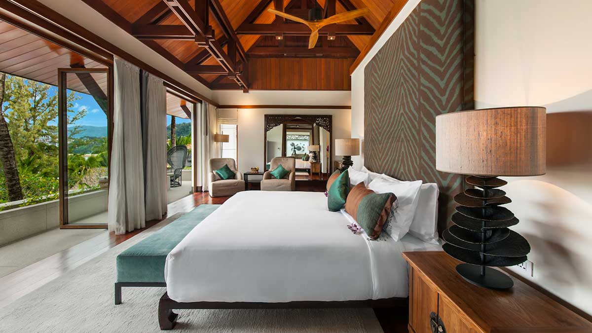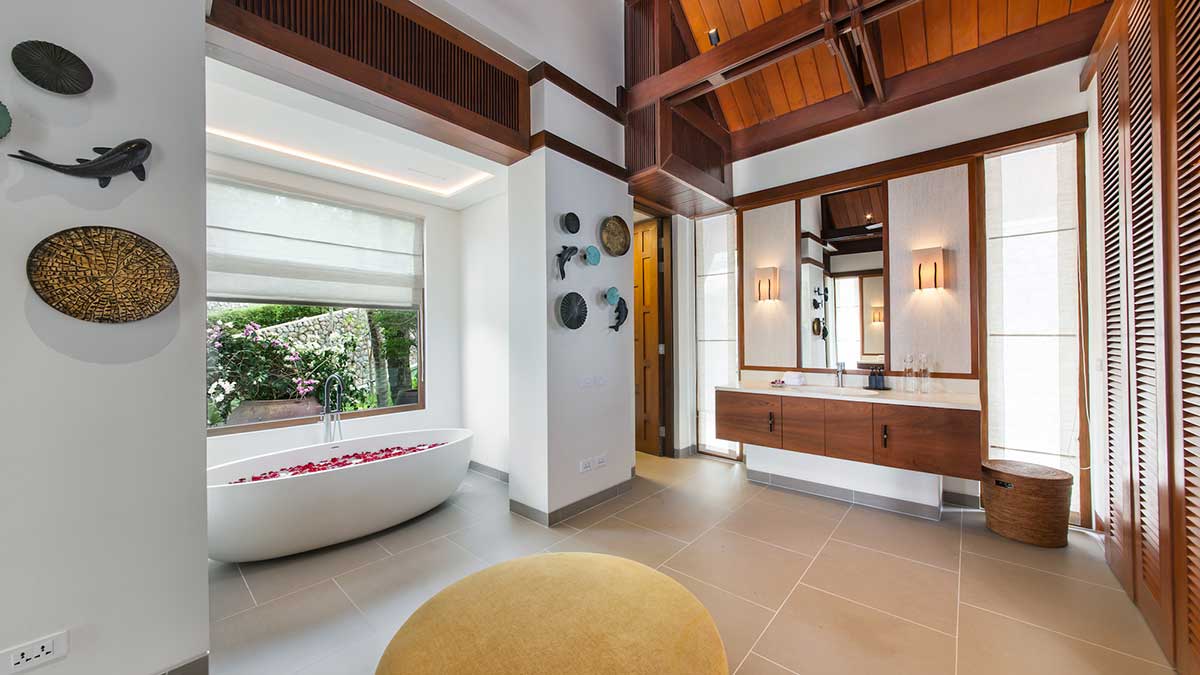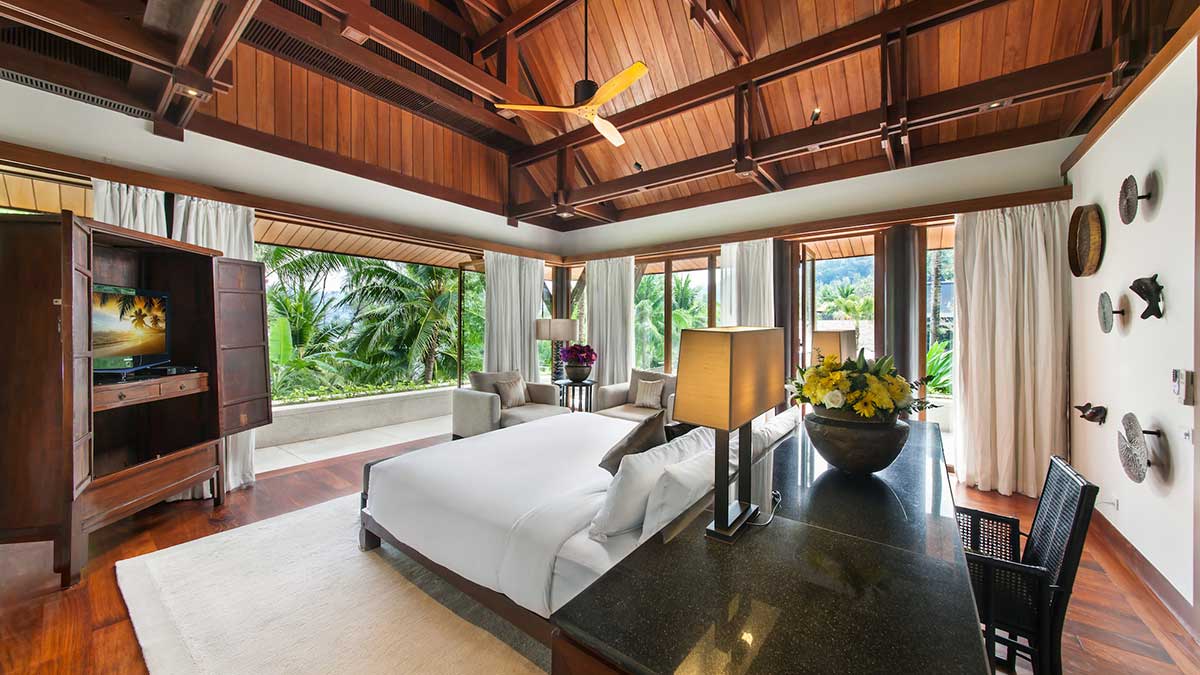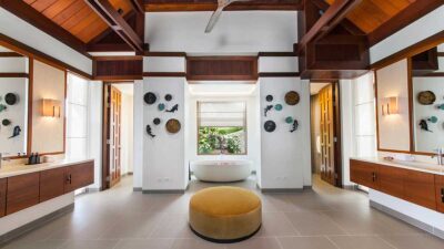 The villa is perched on a headland, with 5 individual pavilions housing the property’s massive 6 bedrooms, all equipped with immaculate furnishings, ensuite bathrooms with bathtubs, and large glass doors and windows that frame breathtaking ocean views. Facing the Andaman Sea, you’ve got endless views of the blue sky and crystal, blue waters of the famous Phuket coast. The villa pays homage to traditional Thai architectural details with a dominant contemporary aesthetic. Large, open spaces welcome bright natural light, and the use of floor-to-ceiling glass sliding doors on the living areas and bedrooms allow guests to have an open-air experience welcoming the cool breeze that the lush forest that surrounds brings.