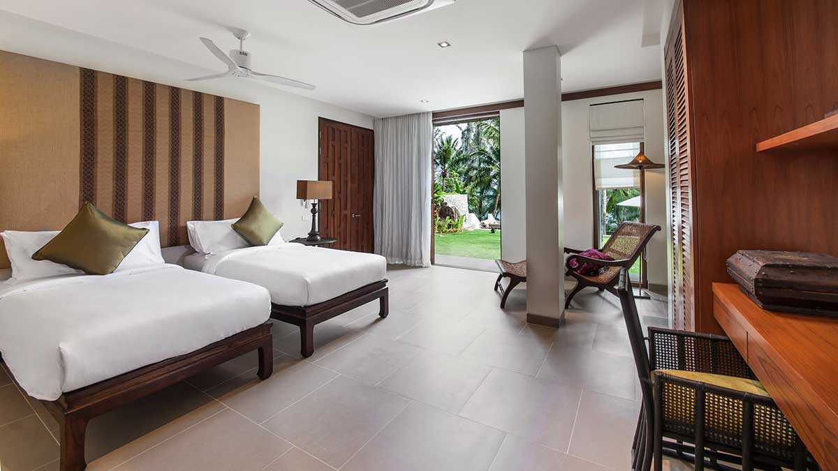 Guest Bedroom 1 (35 m2) — 2 Single beds or king size bed; Pool and garden view; Work desk; His & Her closet; Lounge chair; Air conditioning; Ceiling fan; Safety deposit box; Ensuite bathroom with rain shower & shower, one vanity, and toilet; Toiletries; Hair dryer; Bathrobes; Slippers;; Umbrellas; Connecting to Master Bedroom 2 and Guest Bedroom 2