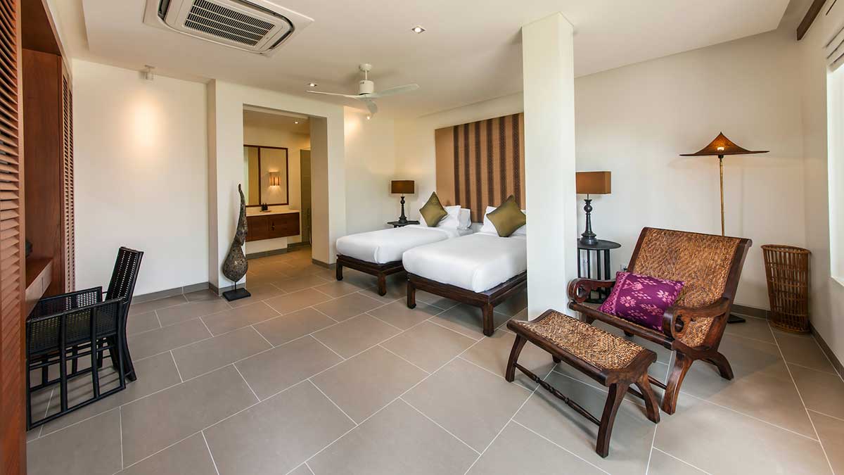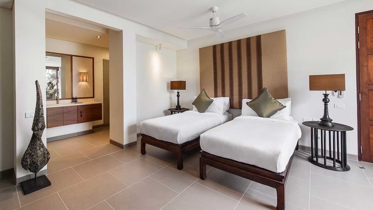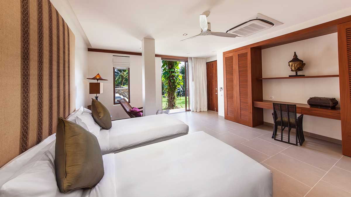 Guest Bedroom 2 (35 m2) — 2 Single beds or king size bed; Pool and garden view; Work desk; His & Her closet; Lounge chair; Air conditioning; Ceiling fan; Safety deposit box; Ensuite bathroom with rain shower & shower, one vanity, and toilet; Toiletries; Hair dryer; Bathrobes; Slippers; Umbrellas; Connecting to Master Bedroom 2 and Guest Bedroom 1