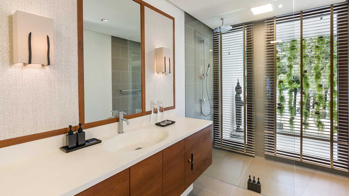 Master Bedroom 3 (70 m2) — King size bed; Pool and ocean view; Balcony with one round sun bed; Work desk; 2 single sofas; 60-cm flat screen TV with True Vision Cable (Platinum Package); His & Her closet; Air conditioning; Ceiling fans; Safety deposit box; Ensuite bathroom with bathtub, rain shower & shower, double vanities, and separate toilet; Toiletries; Hair dryer; Bathrobes; Slippers; Umbrella