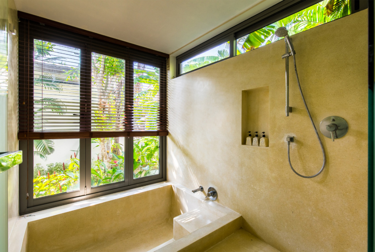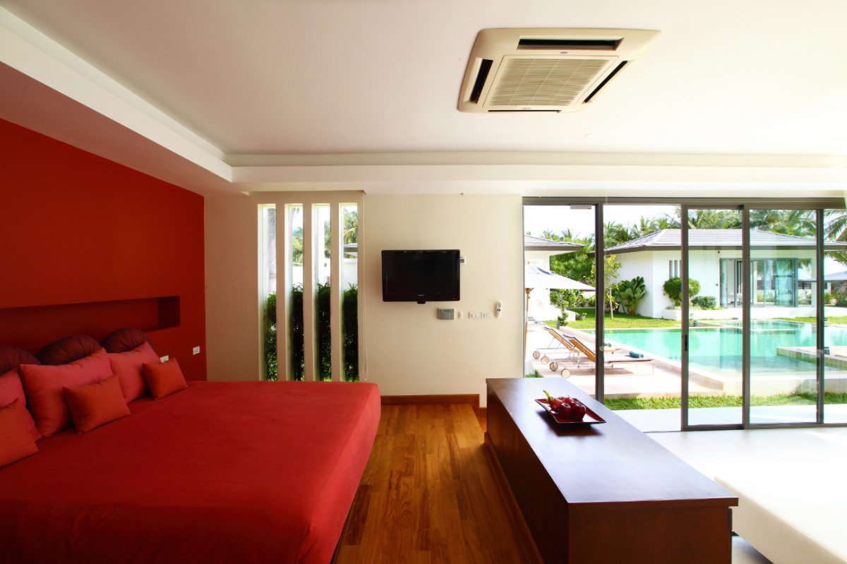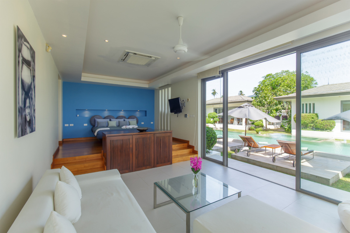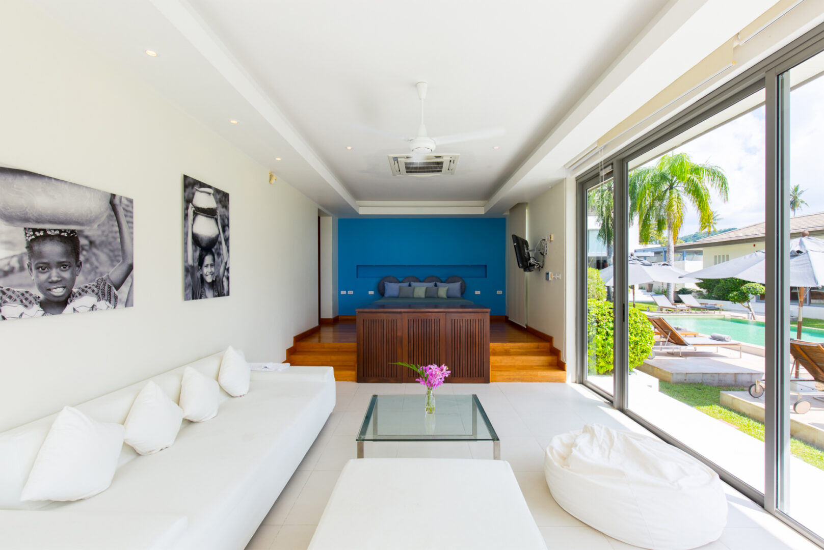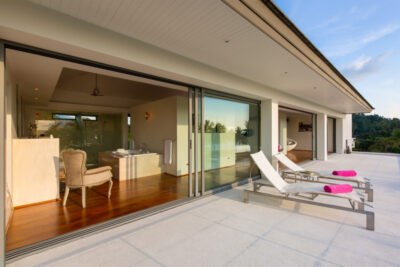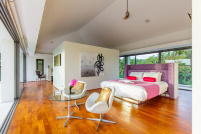 Master Bedroom — Pool, sunset, sea & jungle views; King size bed; Large balcony with 2 sunbeds; Walk-in closet; Safety box; 50-cm flat screen TV with True Vision; 2 chairs + coffee table; Air conditioning; Ceiling fans; Ensuite bathroom with Bathtub, Double rain shower, Double vanities, and Separate toilet; Toiletries; Hair dryer; Bathrobes; Slippers; Attached Living Space with round couch for 2 persons + 100-cm flat screen TV; Attached Kitchenette with fridge/freezer, coffee machine and sink