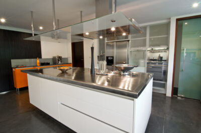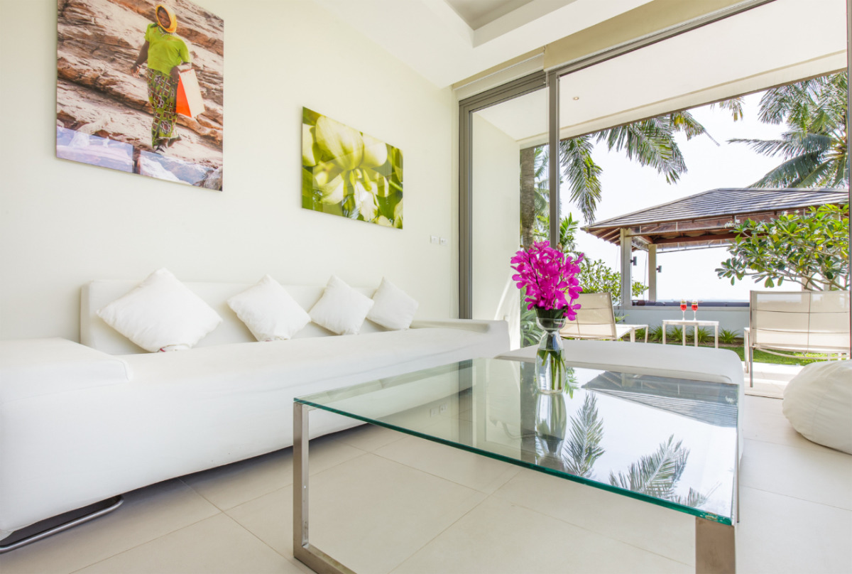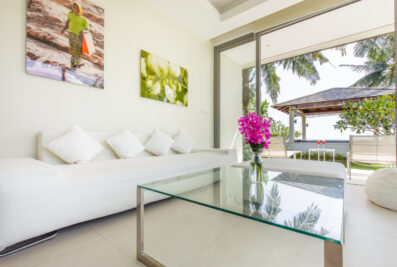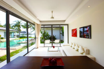 Luxury reveals itself at every turn in the villa’s expansive common areas. The sophisticated living room is adorned with curated furnishings and captivating décor, including a striking oriental gong that adds character and intrigue. The impressive, fully equipped kitchen rivals that of a five-star restaurant, complemented by an additional Thai-style kitchen for authentic culinary experiences. High-tech lighting fixtures cascade elegantly from above, while the open-plan living space flows seamlessly toward the ocean, framing breathtaking views and inviting in the sea breeze.
