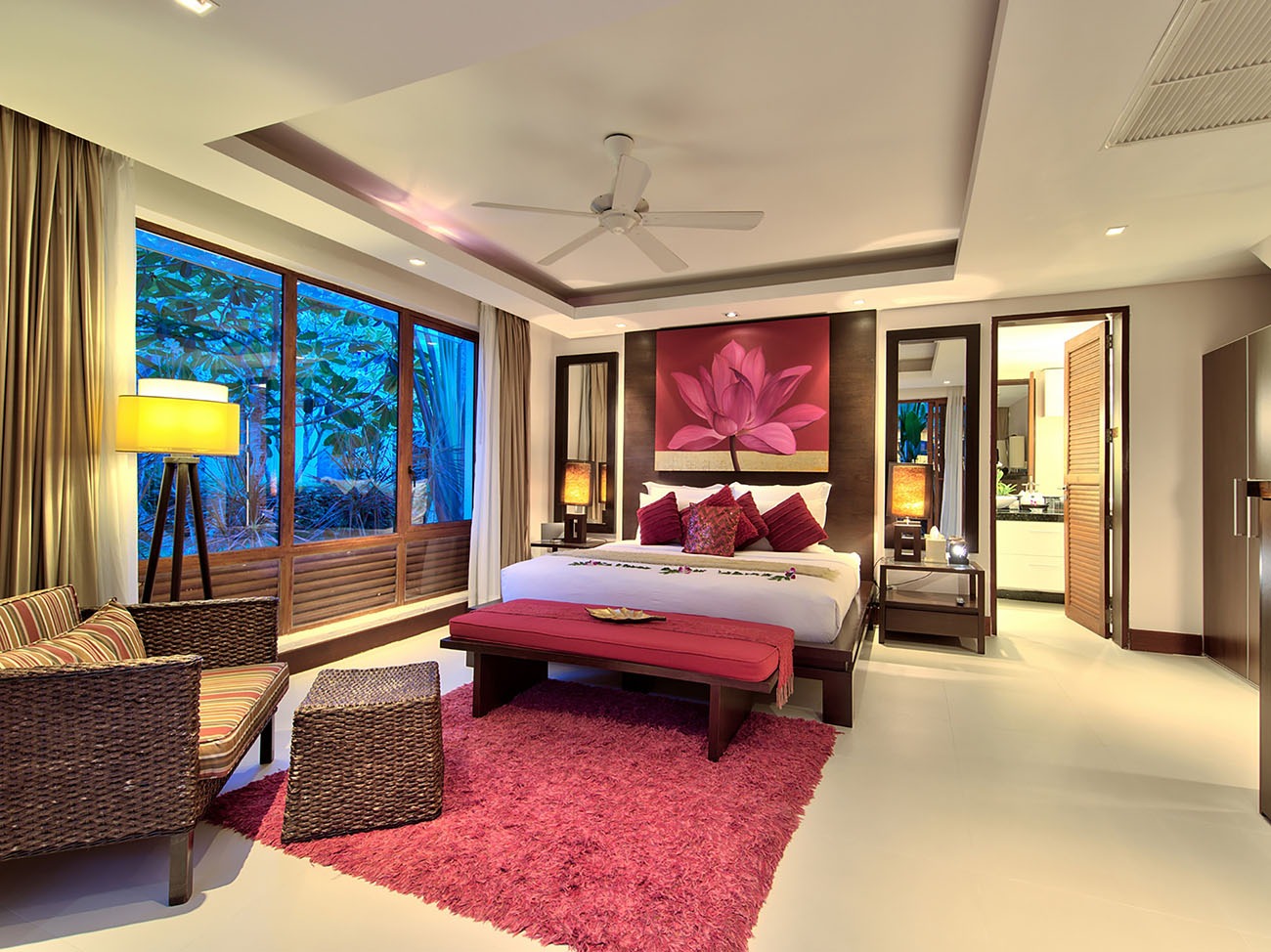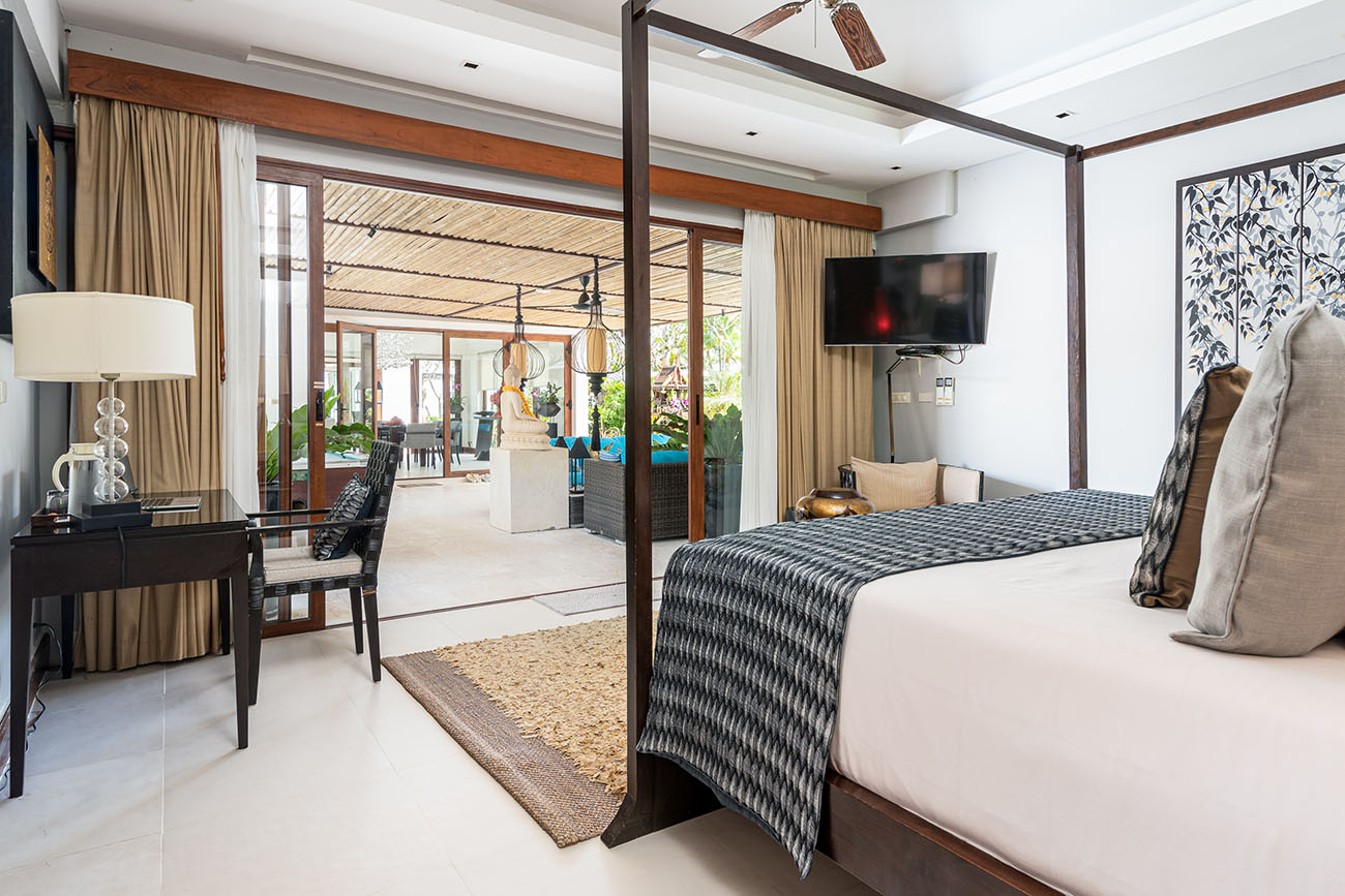 Master Bedroom — Four-poster king-size bed; Connecting door to the central courtyard; Writing desk; Comfortable sitting area; Spacious ensuite bathroom with free-standing ceramic bathtub, jacuzzi, walk-in shower, double vanity, toilet, and view of the pool and sea; Separate dressing area with generous wardrobe; Drawer space; Personal safe; Satellite/cable TV; CD/DVD player; Air-conditioning; Ceiling fan; Toiletries; Towels; Slippers; Umbrellas