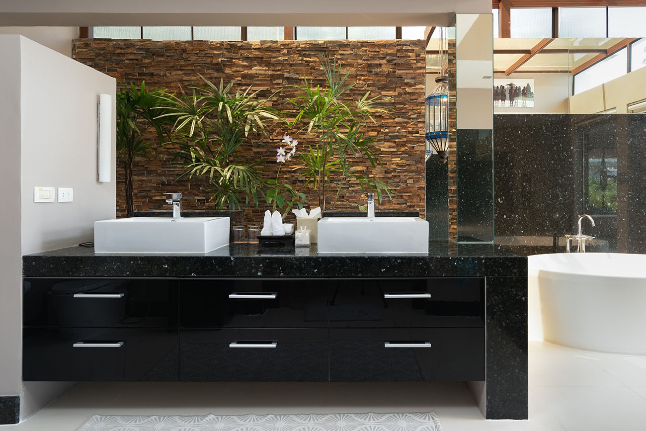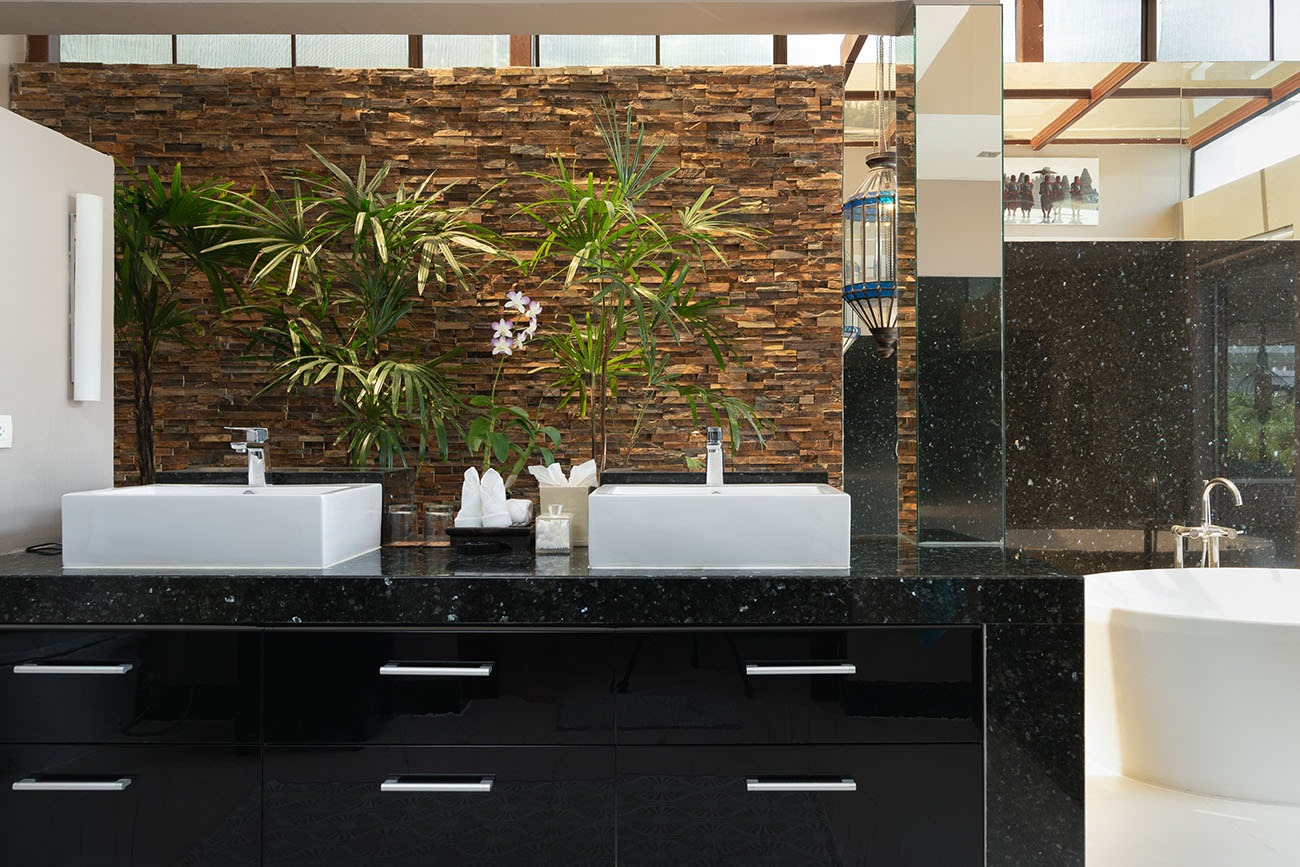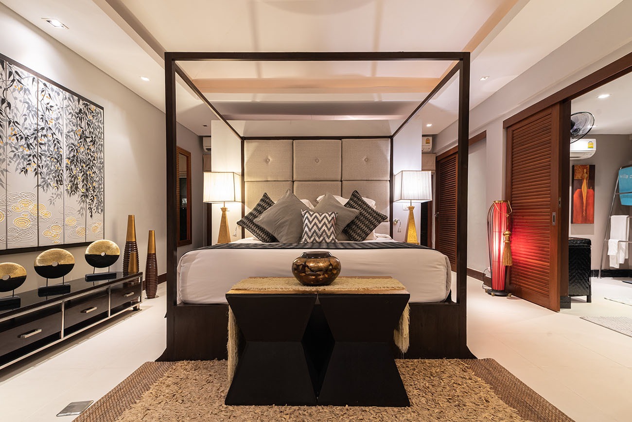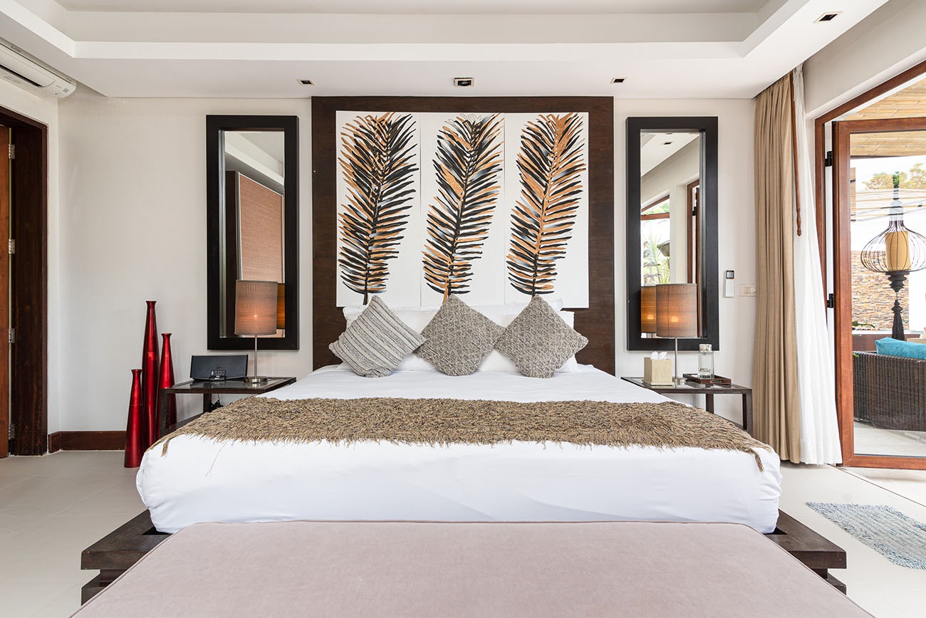 Villa Chi Samui offers five generously sized ensuite bedrooms, each featuring king-size beds. The villa’s design showcases cool ceramic floors and folding glass doors that welcome the tropical breeze, creating a refreshing ambiance. Tastefully furnished in a muted palette of taupe, charcoal, and off-white, with hints of aquamarine and turquoise outdoors, the villa boasts an extensive collection of unique Thai artifacts, adding a touch of cultural charm.