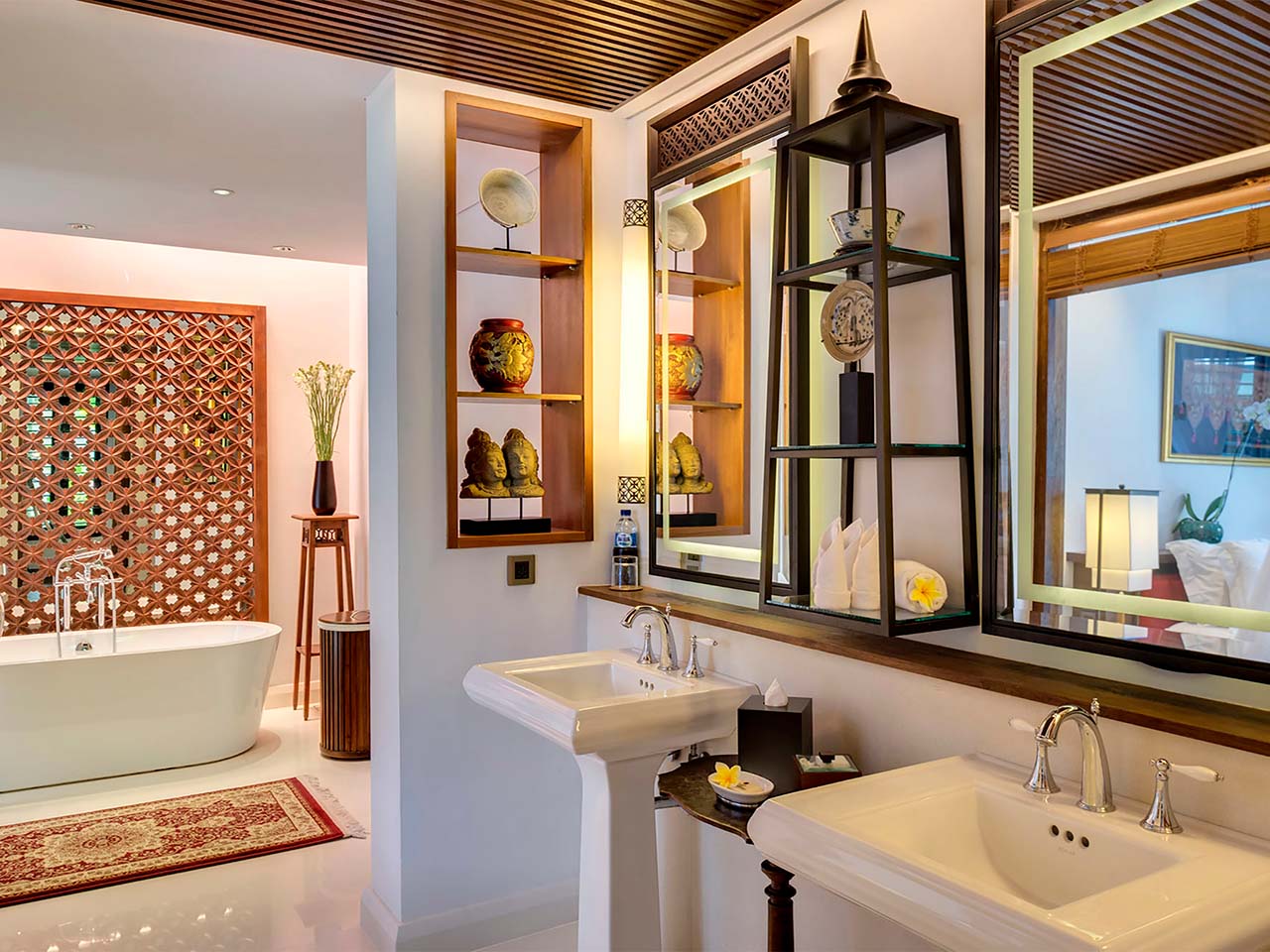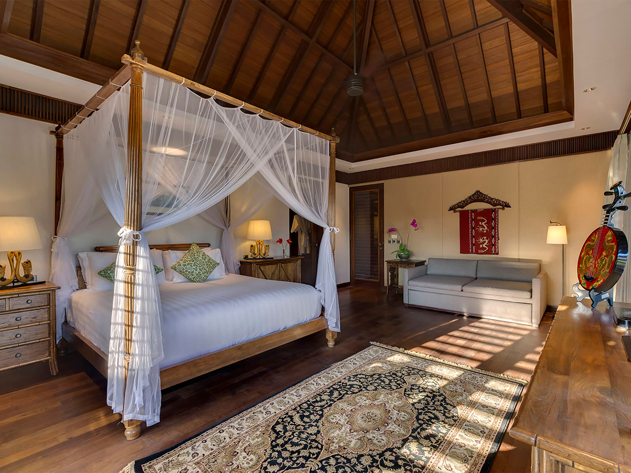 Bedroom 5 — Twin beds, convertible to king-size bed; Air-conditioned; Teakwood floors; Oriental rugs; Antique-style furniture; Large curved TVs with satellite channels; Ensuite air-conditioned bathrooms with twin basins, bathtub, monsoon showers, and walk-in wardrobe with dressing table