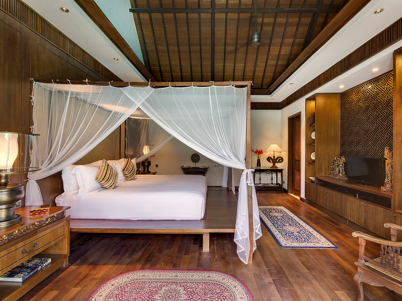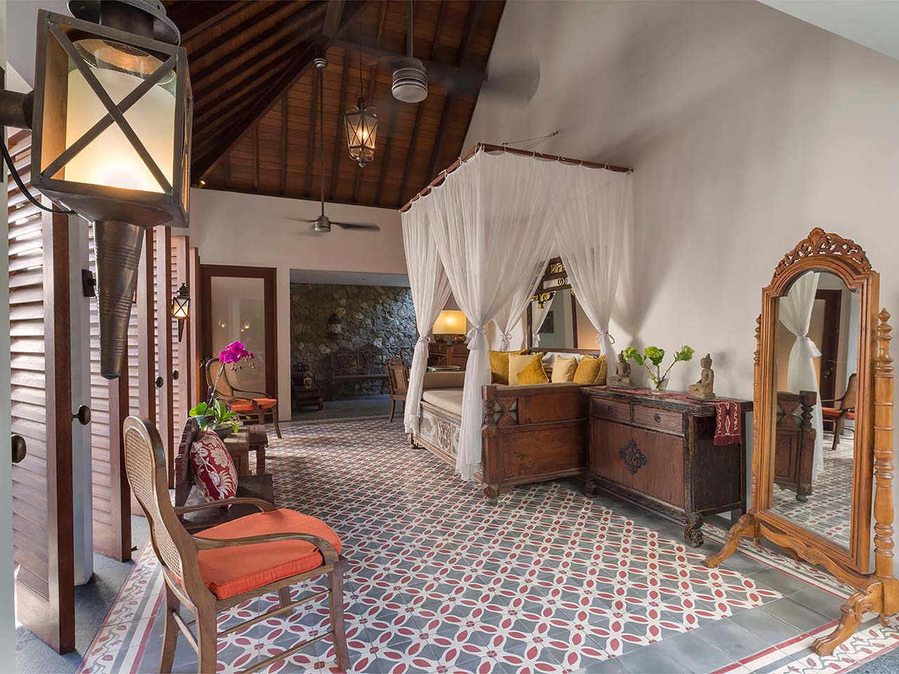Bedrooms 1, 2, 3, & 4 — King-size four-poster beds; Air-conditioned; Teakwood floors; Oriental rugs; Antique-style furniture; Large curved TVs with satellite channels; Ensuite air-conditioned bathrooms with twin basins, bathtub, monsoon showers, and walk-in wardrobe with dressing table