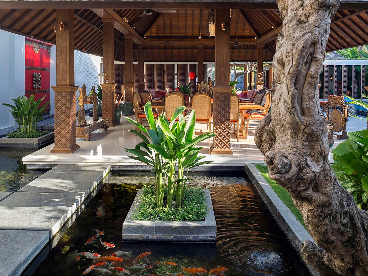 Villa Des Indes II exudes a timeless charm adorned with antiques, colonial-style furnishings, and captivating Asian artifacts. Unwind in unparalleled serenity amidst five pavilions enveloping two azure swimming pools, where the heart of social gatherings unfolds in the expansive open-sided living pavilion. Gazing upon a tranquil koi pond, this grand space invites relaxation while a picturesque balé beckons for moments of contemplation. A two-story edifice houses a chic seating area, a well-appointed bar, and a gourmet kitchen, complemented by a sumptuous bedroom suite boasting a private terrace.