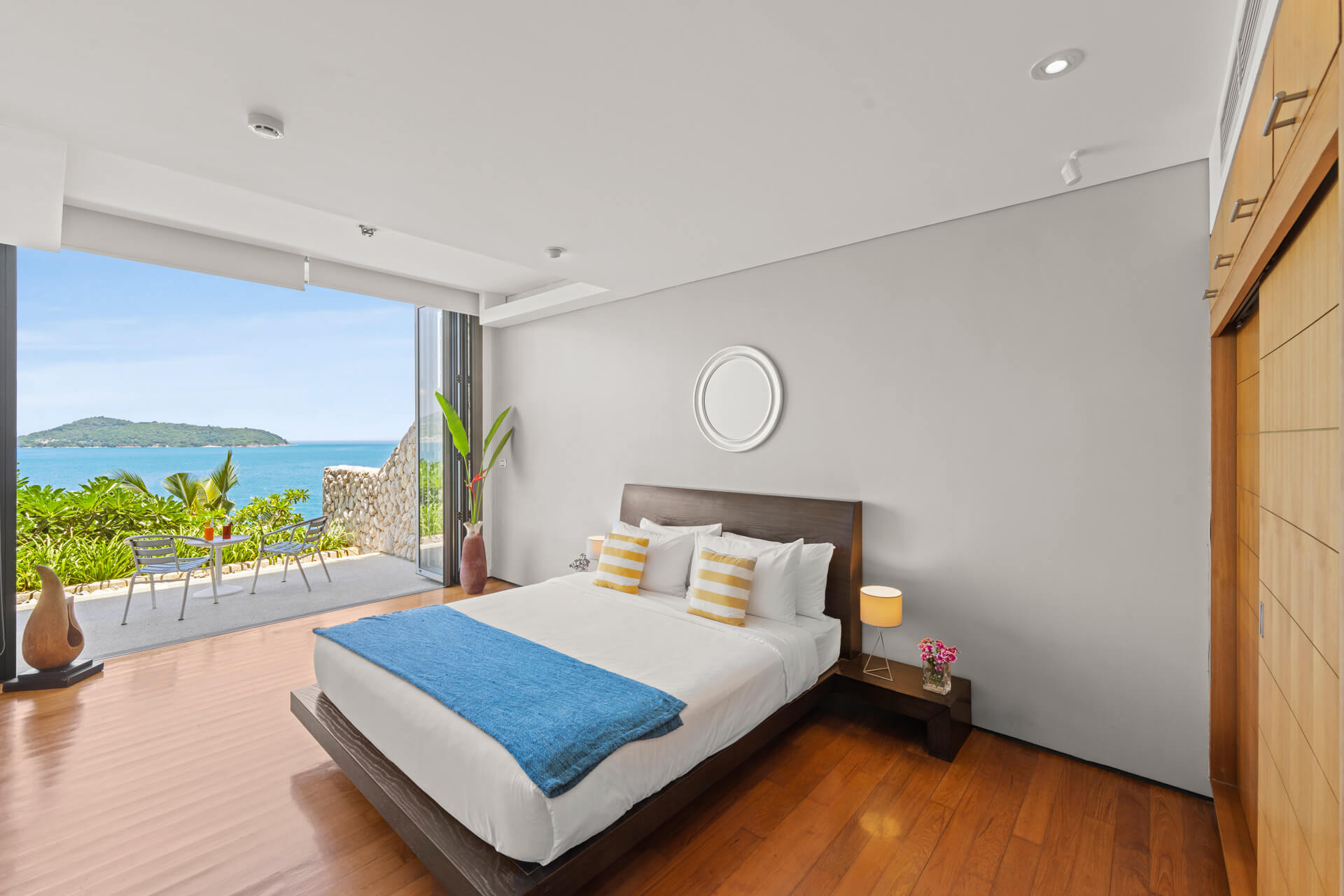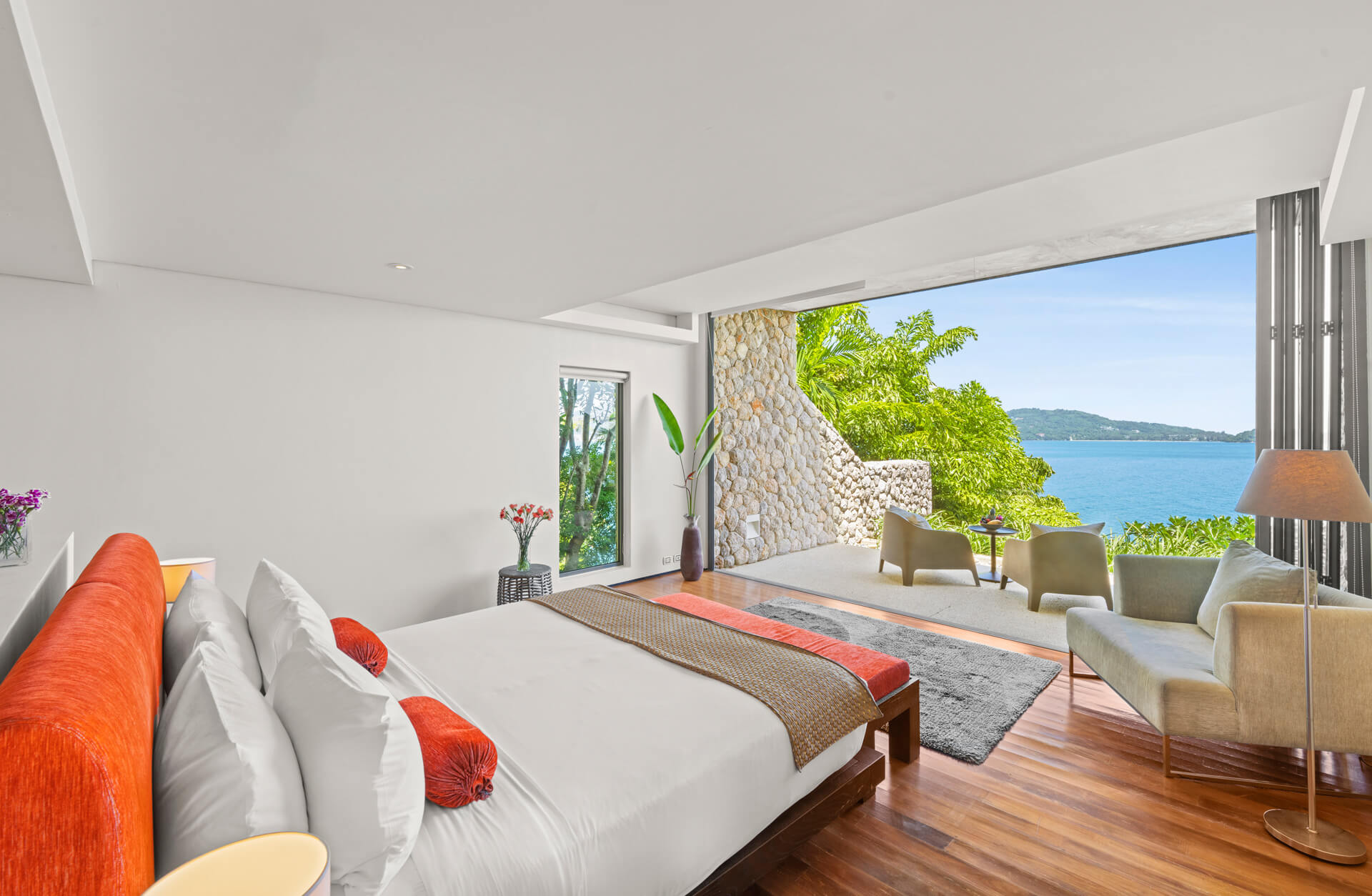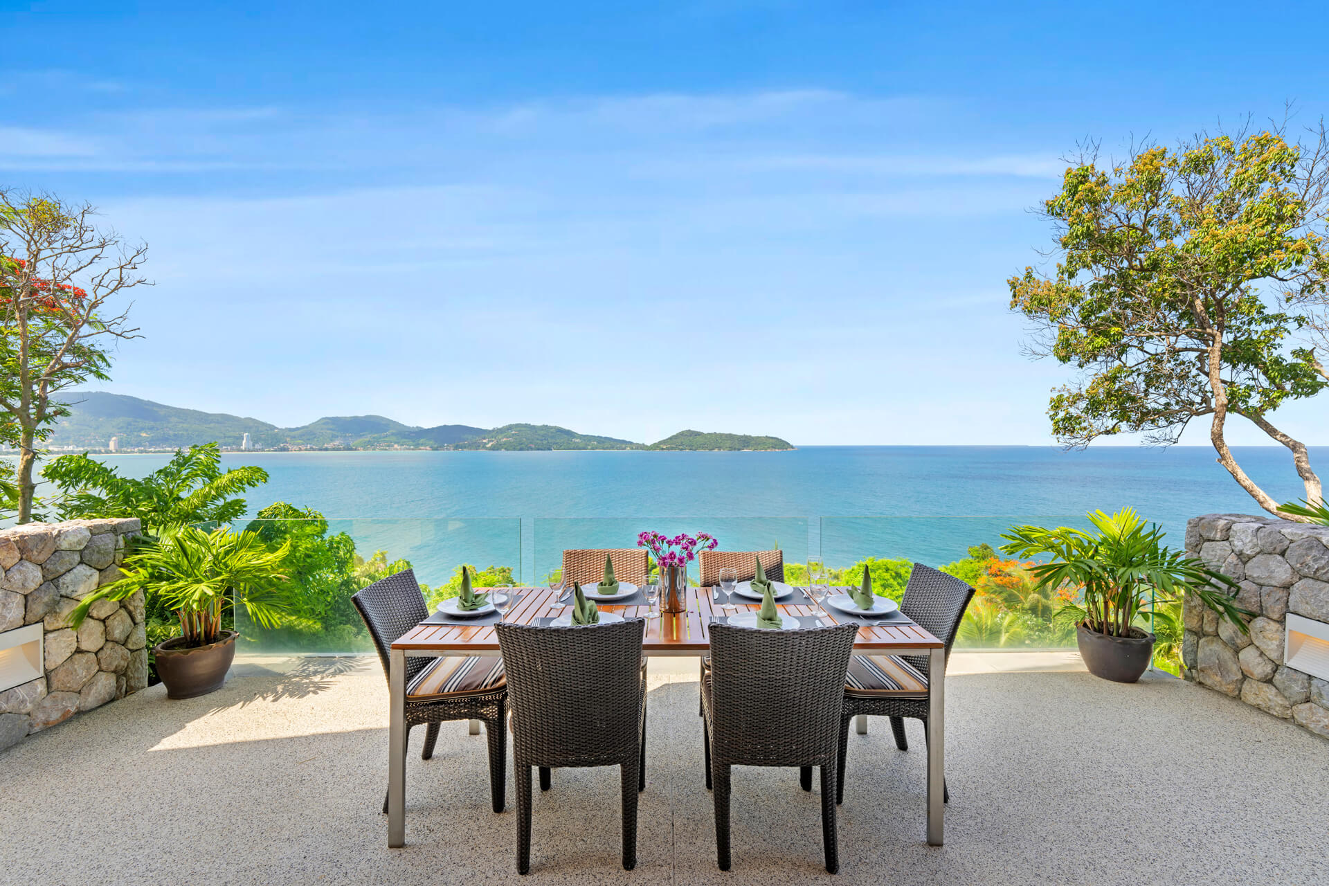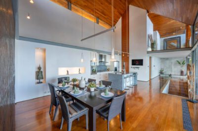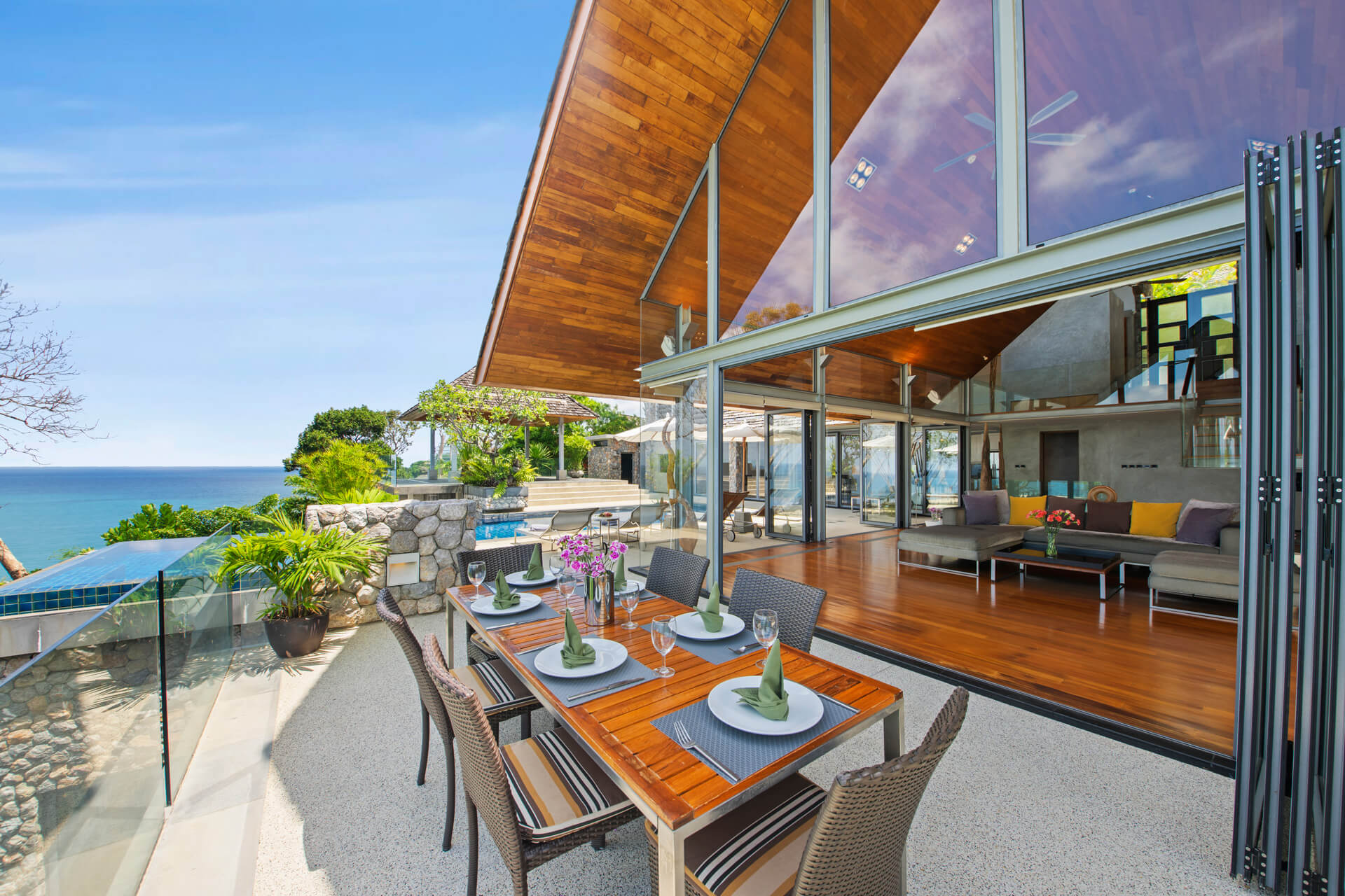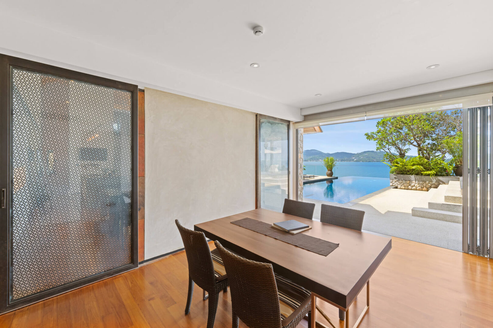 The villa’s 14-meter infinity pool seamlessly blends into the horizon, offering a mesmerizing vantage point for Phuket’s golden sunsets. Beside it, a covered sala with barbecue facilities sets the stage for al fresco gatherings framed by panoramic ocean views. Guests may choose to dine indoors or outdoors, where every meal is enhanced by the soothing rhythm of the waves and the villa’s warm, modern design.
