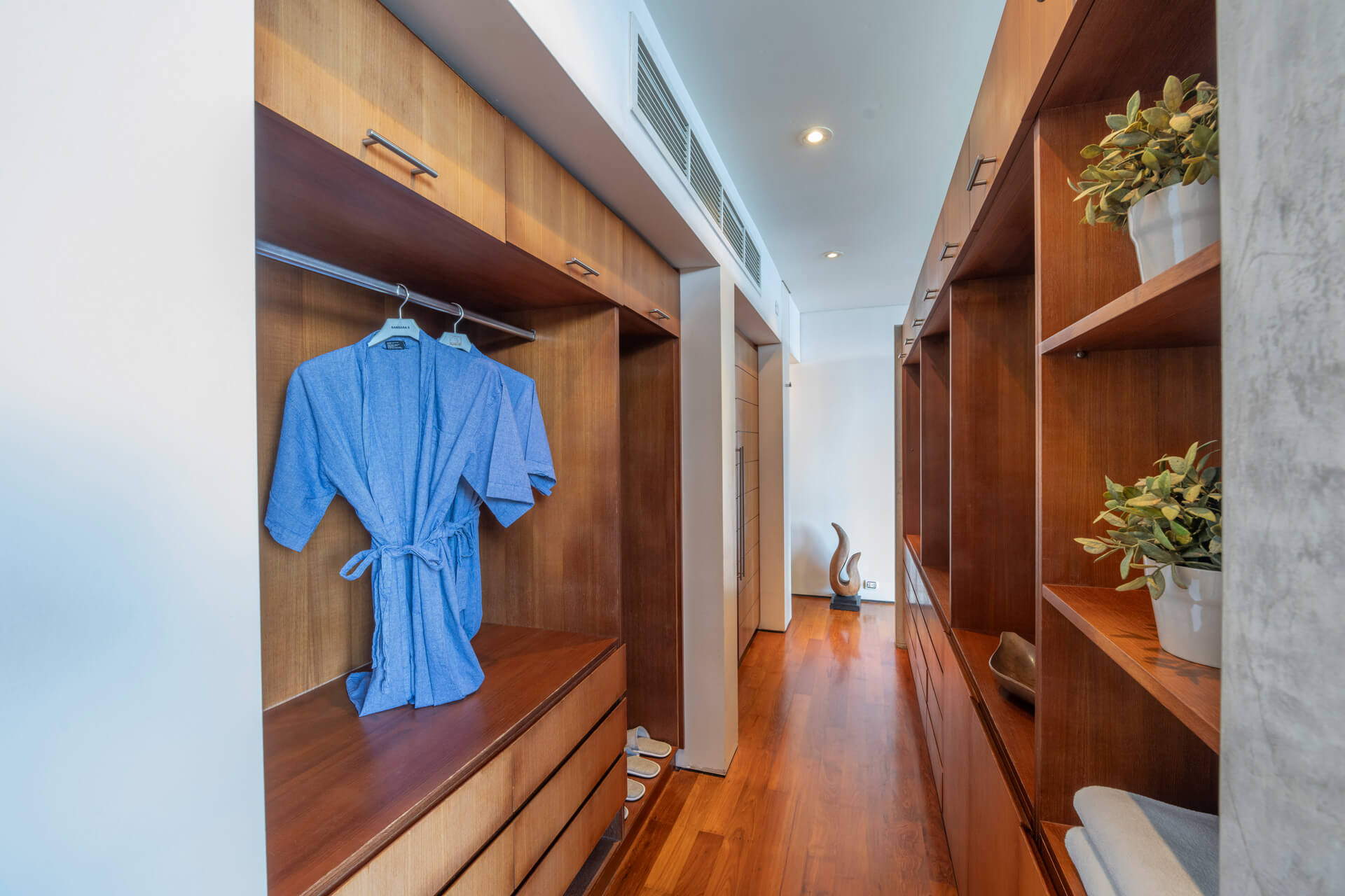 Master Bedroom (50 m2)- King size bed; Ocean, sunset, and garden views; Terrace with 2 chairs; Walk-in closet; One couch; BOSE speaker; Safety box; Air conditioning; Ensuite bathroom with Rain shower, Double vanities, and Toilet; Toiletries; Hair dryer; Bathrobes; Slippers; Umbrellas