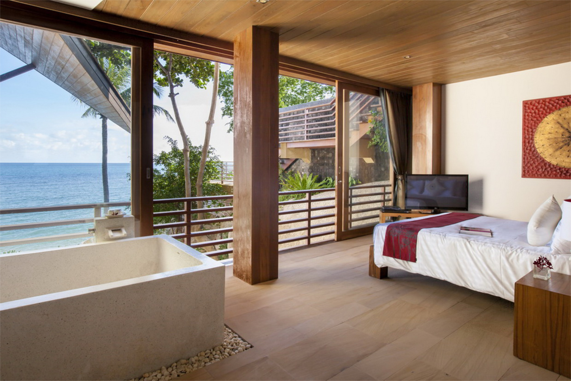 Guest Bedroom 4 — King size bed; Sea view; Terrace with 2 chairs & daybed; Closet; 42-inch flat screen TV with True Vision Platinum package; DVD player; Safety box; Air conditioning; Ceiling fan; Ensuite bathroom with Bathtub, Shower, Double vanities, and Separate toilet; Toiletries; Hair dryer; Bathrobes; Slippers; Umbrellas