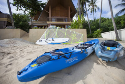 Step outside and discover even more to love. A charming Thai-style pavilion offers an idyllic space for outdoor dining, while the infinity-edge swimming pool blends seamlessly with the horizon. For those craving adventure, kayaks and paddleboards await, ready to carry them across sparkling waters.