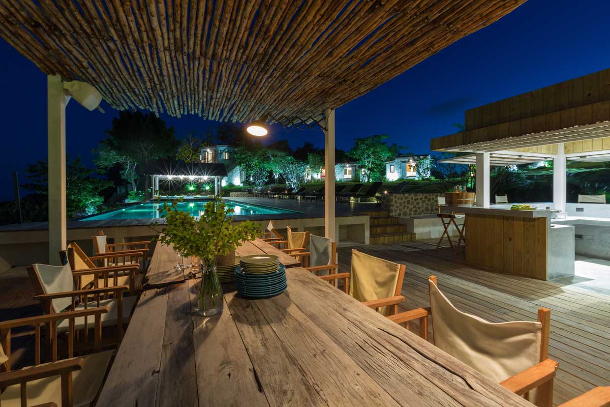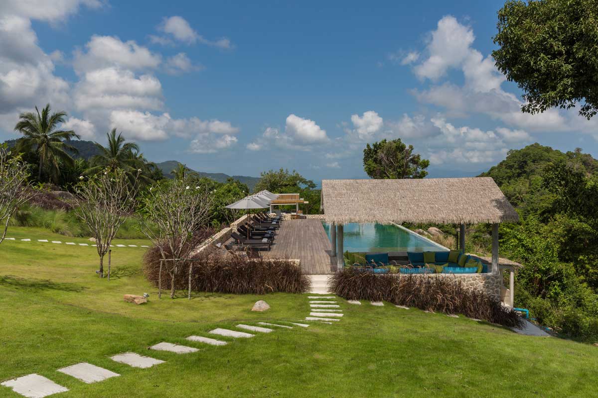 Outside, you’ll also find an infinity pool surrounded by a wooden deck in the midst of the lush garden. Numerous lounge chairs are placed around the pool deck, and there’s a wet bar on site. Off to the side, there is a shaded pavilion for rest from the sun and another dining area. The shaded pavilion boasts a projector screen for outdoor movie nights. In addition to all of these fabulous amenities, Villa Koh Koon features expansive lawns, a deck for yoga or intimate gatherings, and professional staff who attends to your every need.