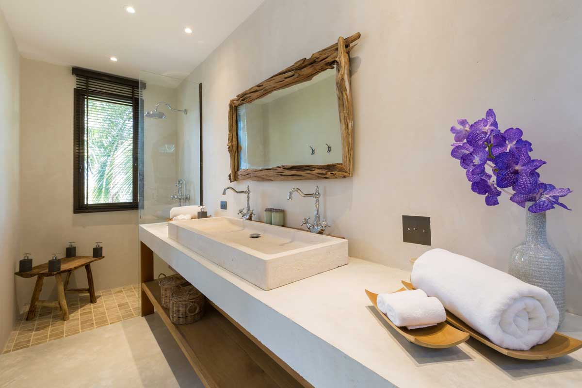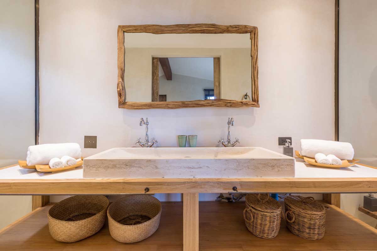 The master bedroom is connected to the library, and lucky patrons can see the ocean from the bed and private terrace. There’s a charming outdoor shower, but the master bathroom features an enclosed shower in case of rain along with two vanities. Underneath the main living room, there’s another lounge room which comes with a TV, DVD player and PlayStation 4. Additional bedrooms are situated in four different pavilions on the property. Outfitted with crisp linens, air conditioning, outdoor terraces, and personal bathrooms, these bedrooms are ready to handle every need. Crete stone walls and simple wood furnishings add to the Mediterranean vibe.