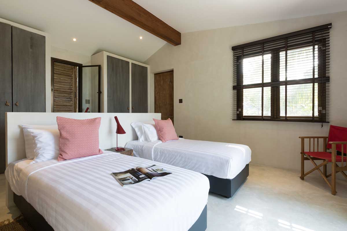 Children’s Bedroom 1 — 4 single beds; Sea view; Large Balcony with 3 seatings; Air conditioning; Mosquito net; Ensuite bathroom with Rain Shower, Vanity, and Toilet; Toiletries; Hair dryer; Bathrobes; Umbrellas