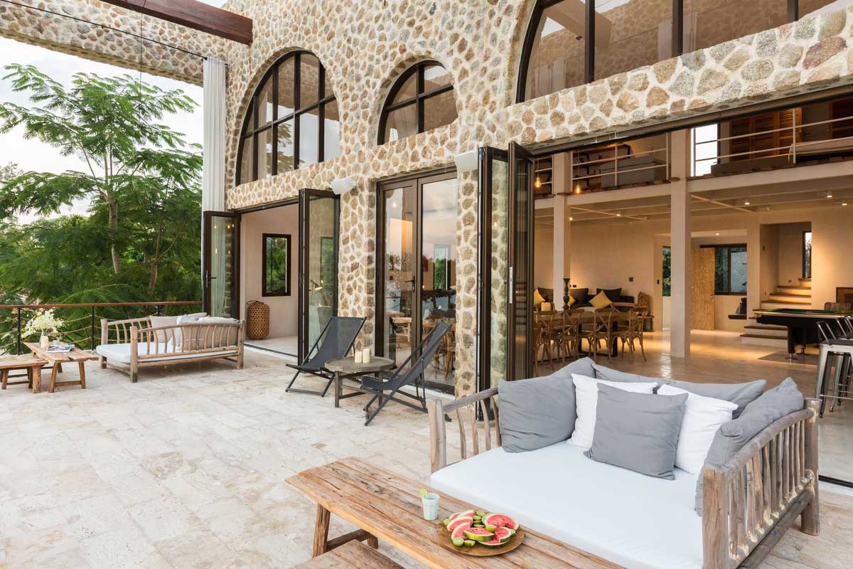 Located on a sprawling hillside with a view of Chaweng Bay, Villa Koh Koon features an impressive layout. The architecture and decor are a harmonious blend of Eastern and Mediterranean styles. Eclectic, but comfortable, this villa is perfect for family holiday gatherings and personal relaxation getaways. Villa Koh Koon was built to blend with the surrounding environment. The main buildings are clad in natural rock material, and huge boulders accent the garden. Stone pathways wind through lush lawns to connect all the buildings. Many design elements of the house are reminiscent of a French farmhouse, but the surrounding coconut palms give you a distinctly tropical feel.