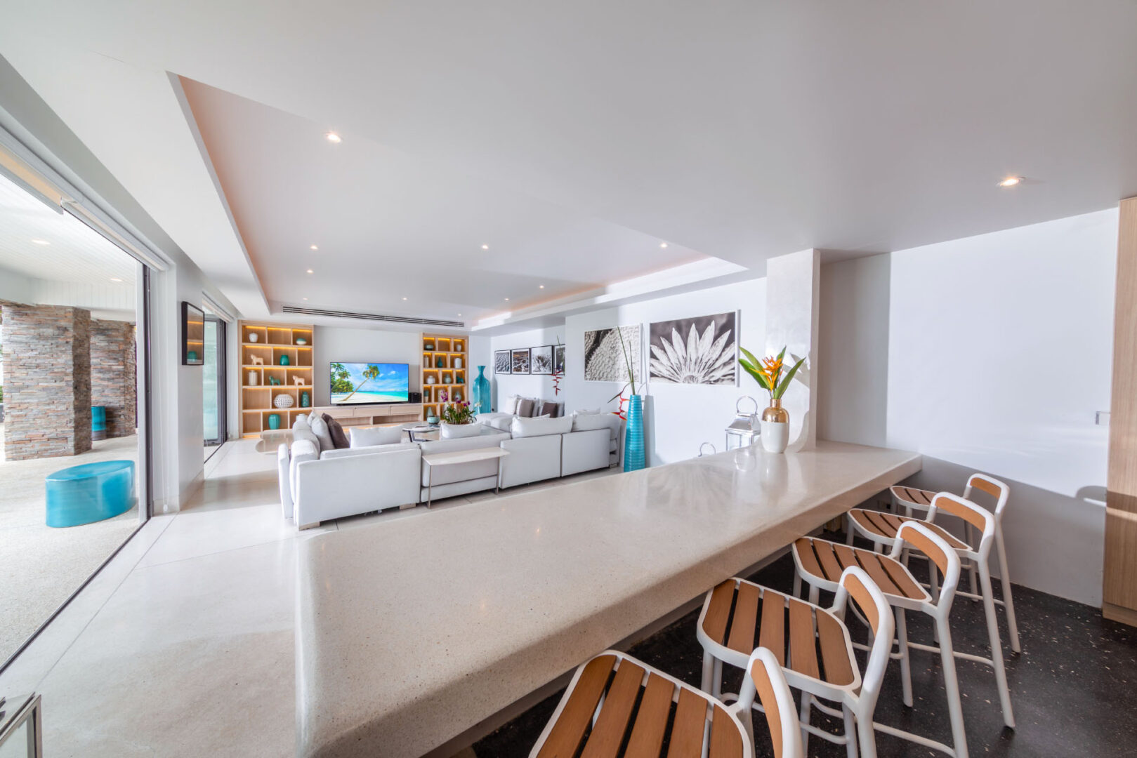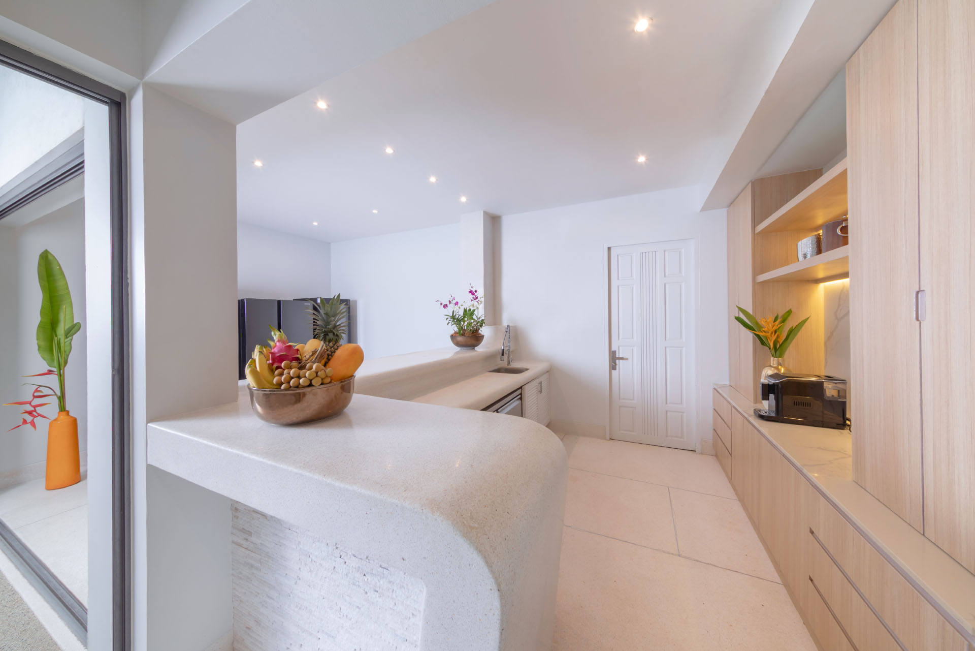 The villa’s exterior showcases beautiful Thai architecture with a steeply sloping tile roof that curves upward on the edge. As guests walk towards the entrance, they shall see an abundance of green plants and foliage – an inviting introduction to what awaits inside the villa.