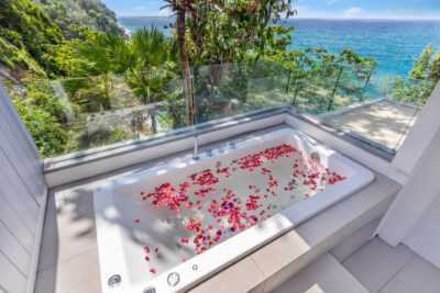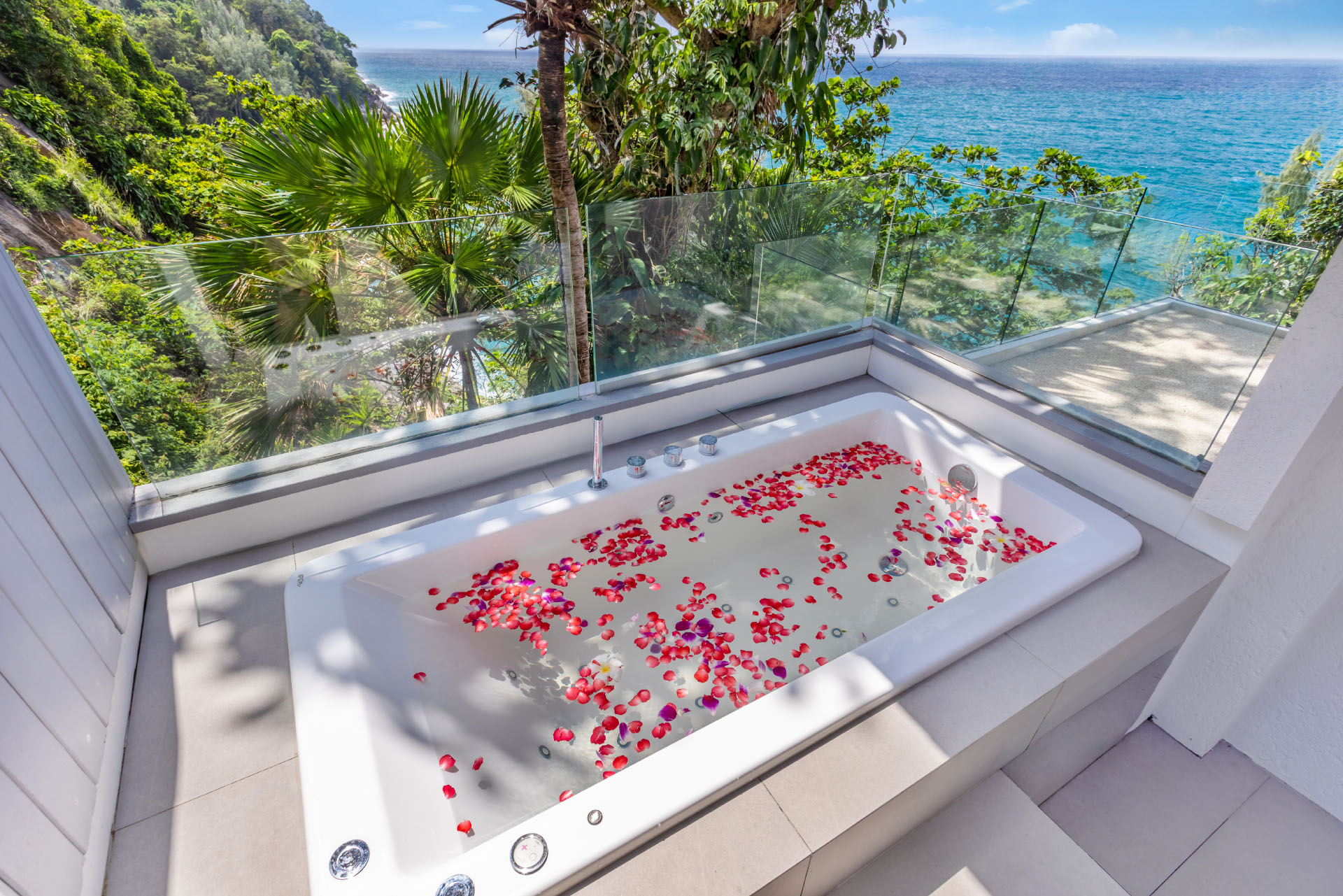 Guest Bedroom 7 (47 sqm) — Sea and sunset view; King-size or 2 single beds; L-Shape sofa (seat up to 4 persons); Terrace with 2 seats; 55-inch Smart TV with cable; Ceiling fan; Air-conditioning; Safety deposit box; Ensuite bathroom with rain shower and shower; two vanities, and separate toilet; Outdoor bathtub (plunge pool); Work desk with mirror; Mini bar with small fridge, water heater, and tea cups; Walk-in his and her closet; Toiletries; Hair dryer; Bathrobes; Beach bag & hat; Slippers (indoor and outdoor); Umbrellas