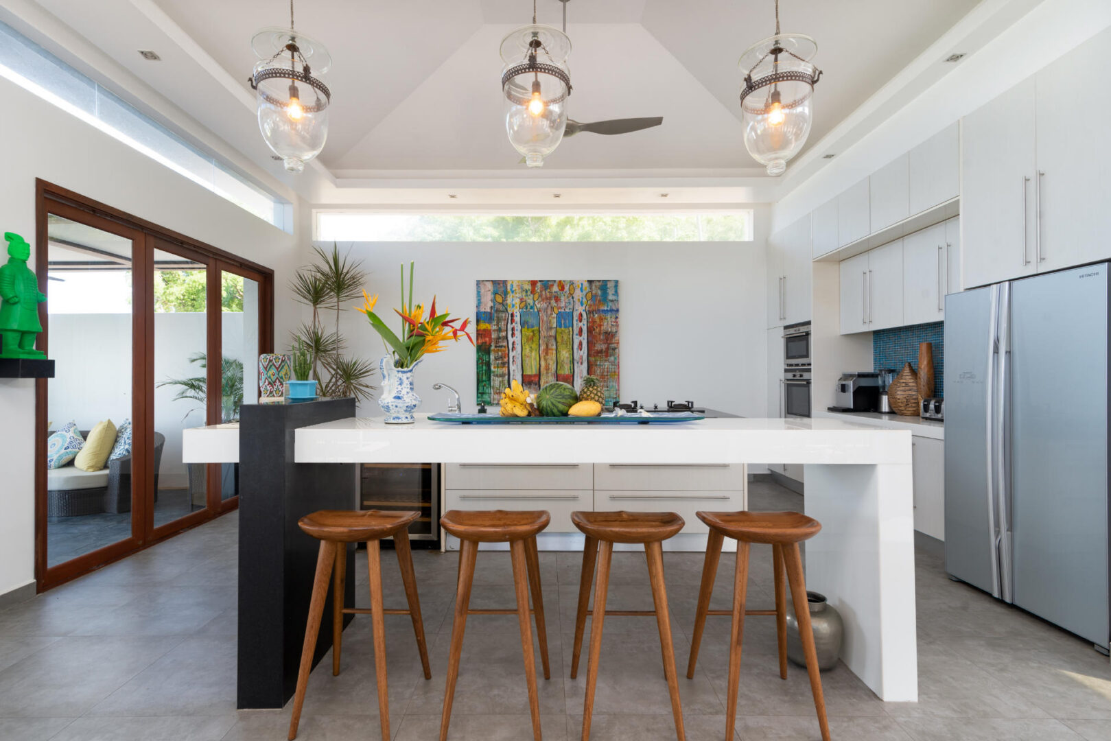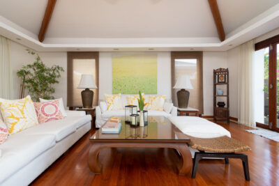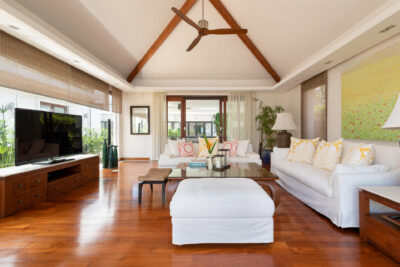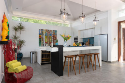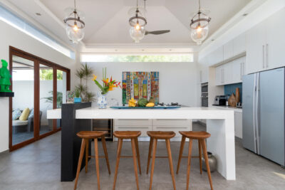The chic, high-vaulted ceiling living room, bordered by a shallow pond, is ideal for relaxing and lounging with good company. The villa’s beachfront pavilion holds a fully-equipped kitchen with a marble breakfast counter and a lovely dining room surrounded by floor-to-ceiling windows and glass doors for a romantic ocean view.