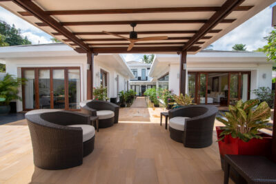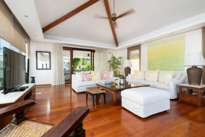 The master bedroom and four guestrooms come with an ensuite bathroom, flatscreen TV with satellite, a safety deposit box, a king-size bed over tasteful wooden floors, and bright, nature-inspired decor. Other room features include a work desk, his and her closet, weighing scale, chair and table, sofa, covered terrace, bathtub, bathrobes, and much more! Each spacious bedroom is like a peaceful sanctuary for guests to unwind and release their minds in a zen-like atmosphere.