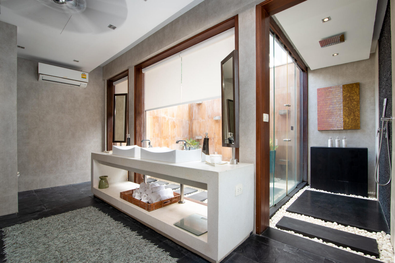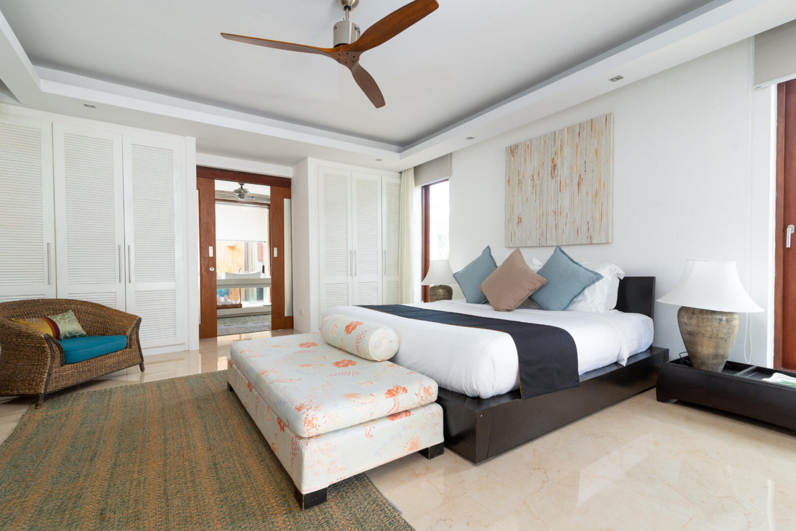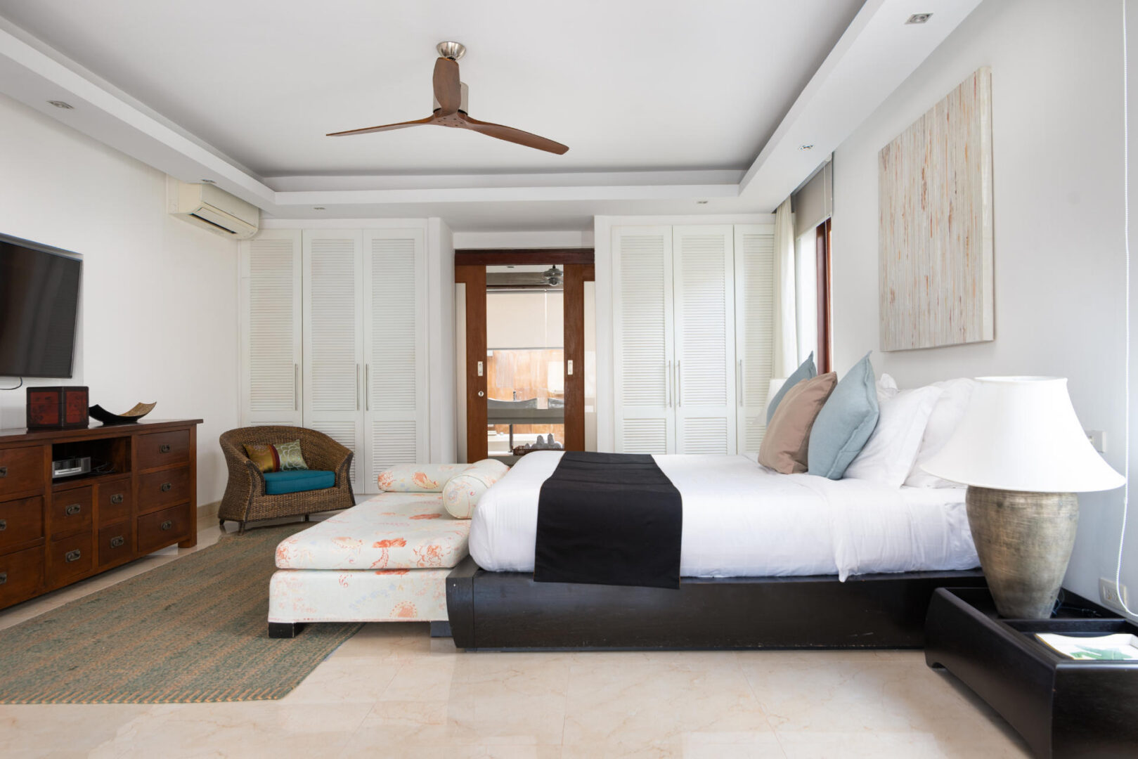Master Bedroom (70 m2) — King size bed; Day bed; 55 inch flat screen TV with True Vision (Platinum Package); DVD player; Work Desk; BOSE portable speaker; His and her closet; Safety box; One chair; Air conditioning; Ceiling fan; Ensuite bathroom with Rain shower & shower, Outdoor bathtub, Double vanities, and Toilet; Toiletries; Hair dryer; Bathrobes; Weighing scale