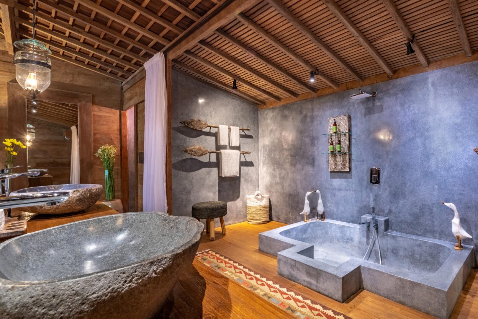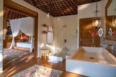 Joglo 4: Balcony with pool and garden view; 1 King size bed; Minibar; Air-conditioning; Wardrobe cabinet; Ensuite bathroom with bathtub, shower, double vanity and toilet with bidet; Bathrobe; Toiletries; Hairdryer; Towel
