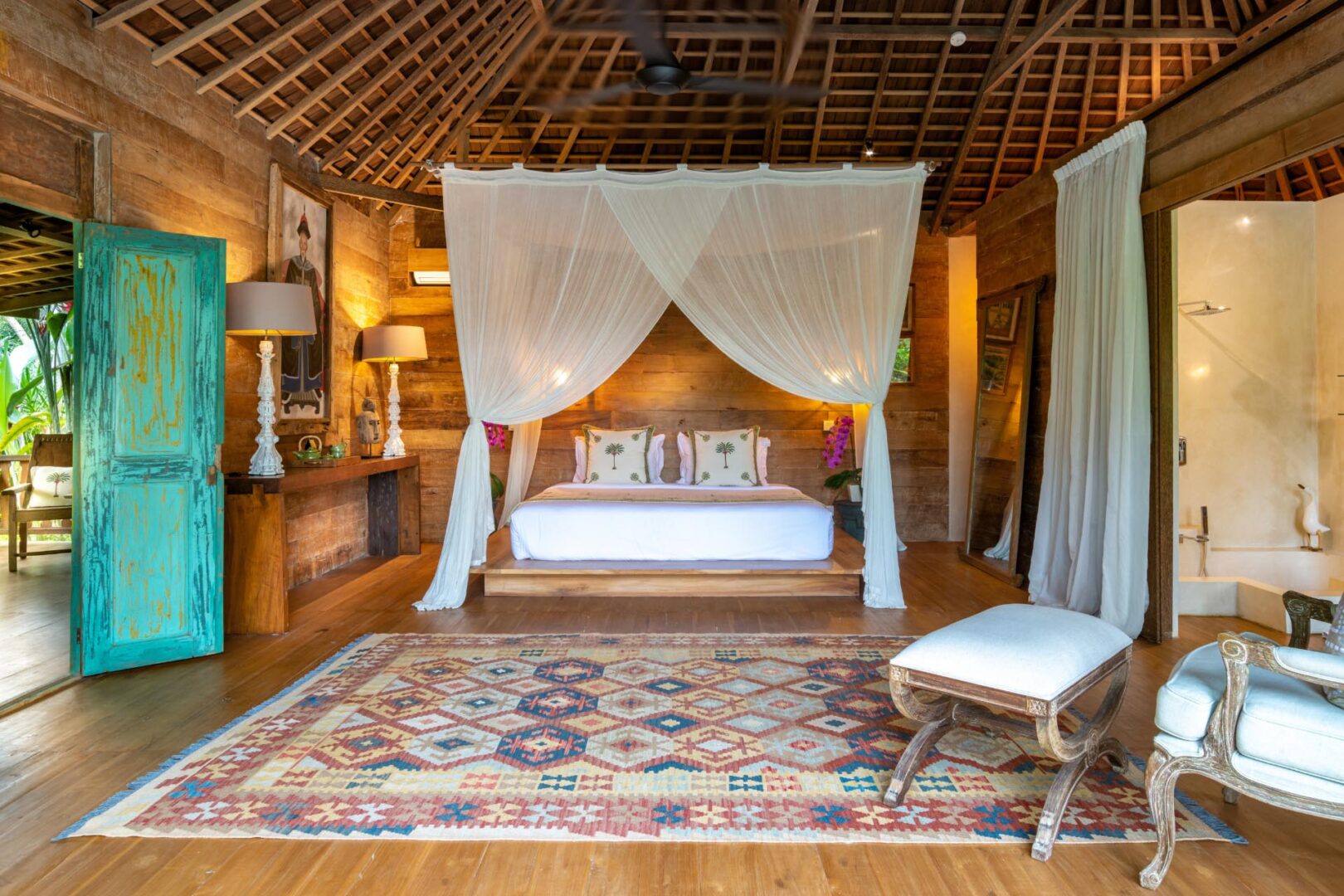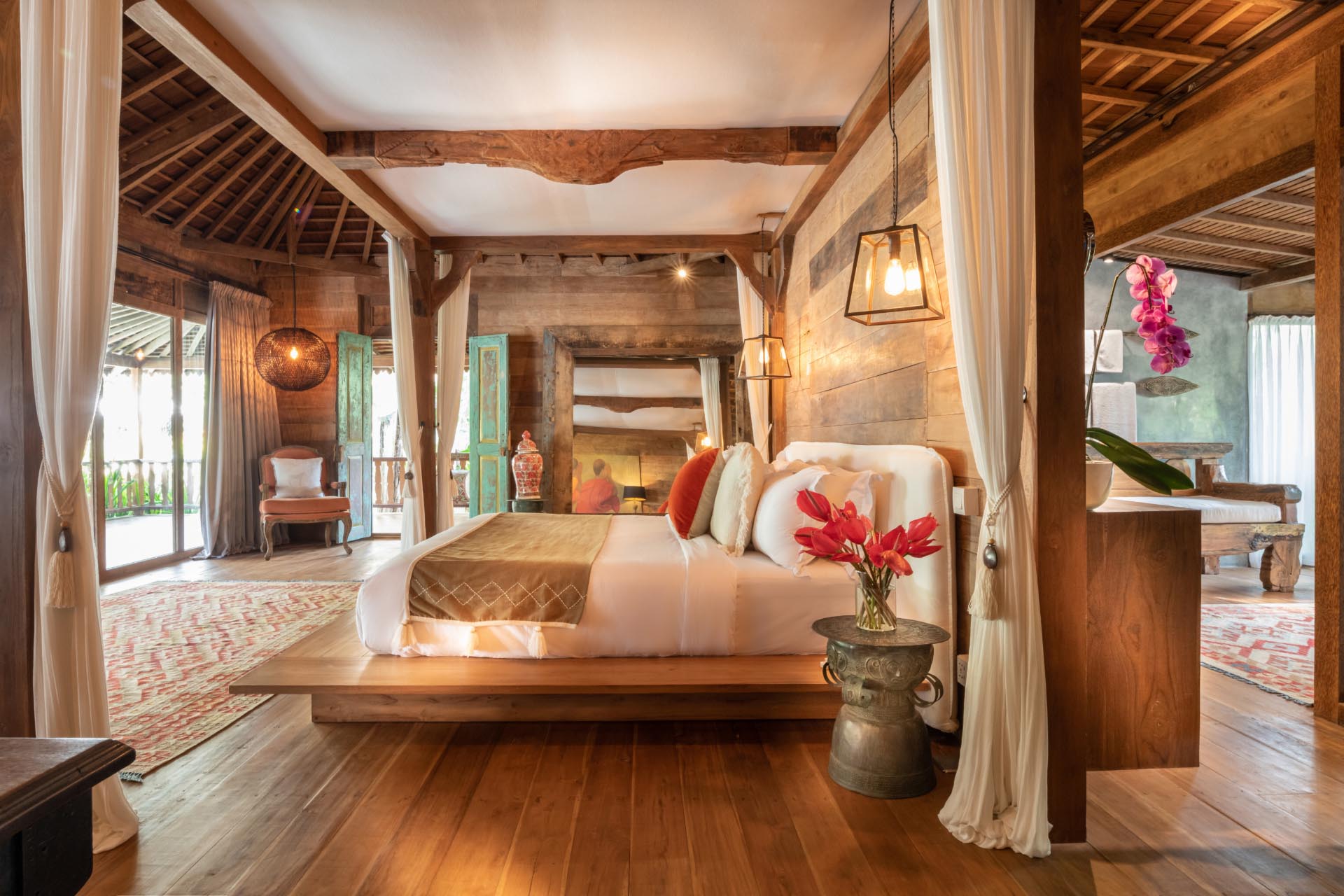 Joglo 2: Balcony with pool and garden view; 1 King size bed; Daybed; Minibar; Air-conditioning; Wardrobe cabinet; Ensuite bathroom with bathtub, shower, double vanity and toilet with bidet; Bathrobe; Toiletries; Hairdryer; Towel