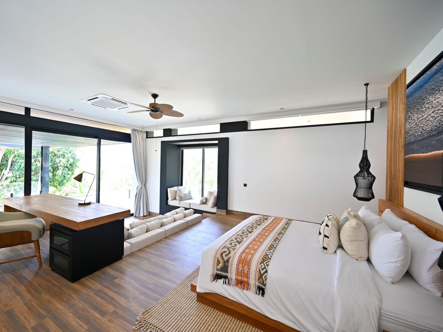 Master Bedroom Suite – Super king-size bed with KingKoil mattress; private terrace with loungers; panoramic rice field view; deeply cushioned lounge area; separate recessed window seat/reading nook; 2.7-metre desk with upholstered chair; dressing area; two walls of closet space; air conditioning; ceiling fan; terazzo bathroom with walk-in shower, bathtub, toilet with bidet, bathrobes, toiletries, fresh towels, towel rack.