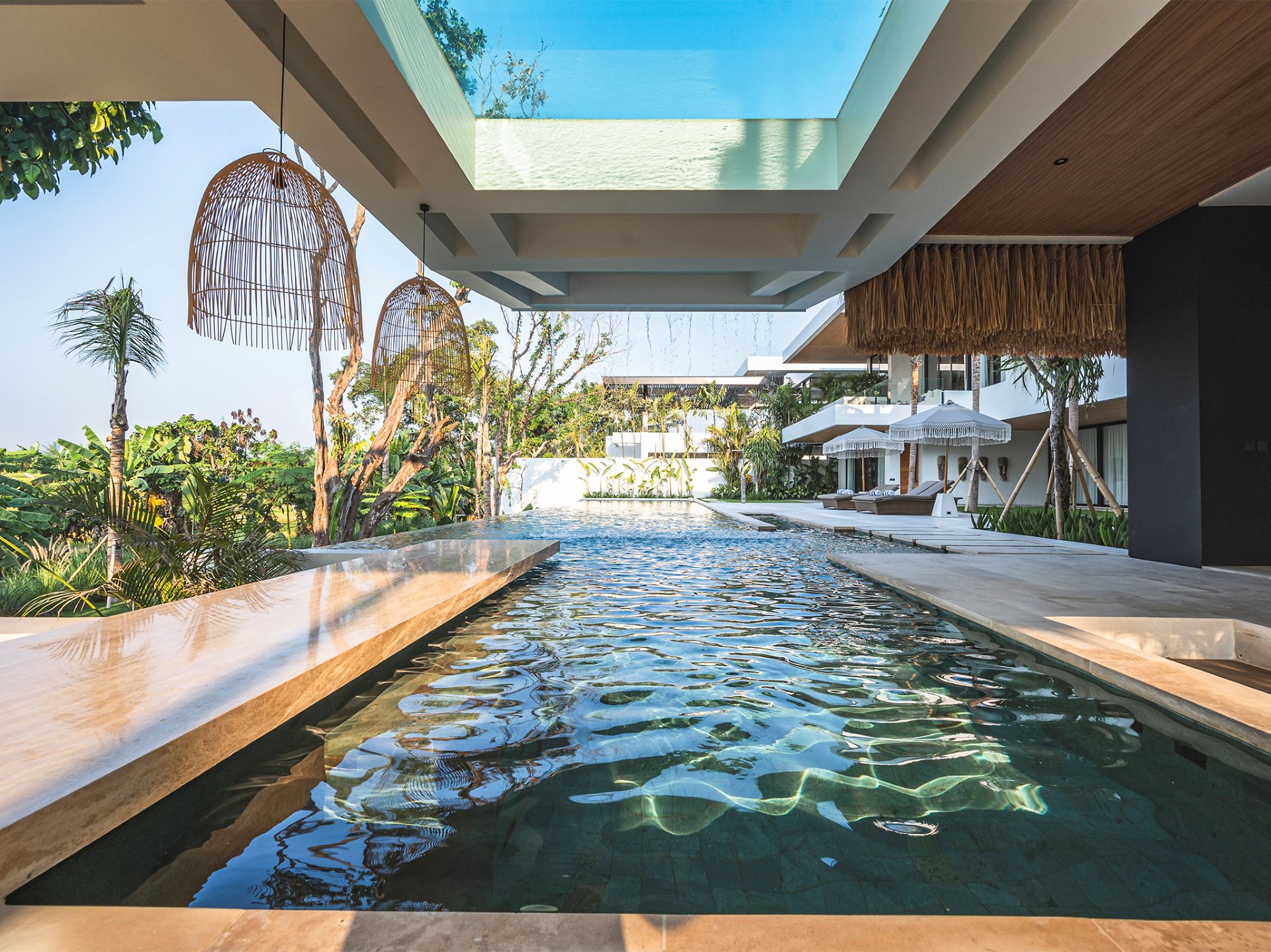 Each bedroom is a serene retreat, with the east wing offering tranquil havens and the west wing boasting a magnificent master suite. This upper-level sanctuary features a striking glass-bottomed pool, floating above a sunken lounge and shimmering main pool.