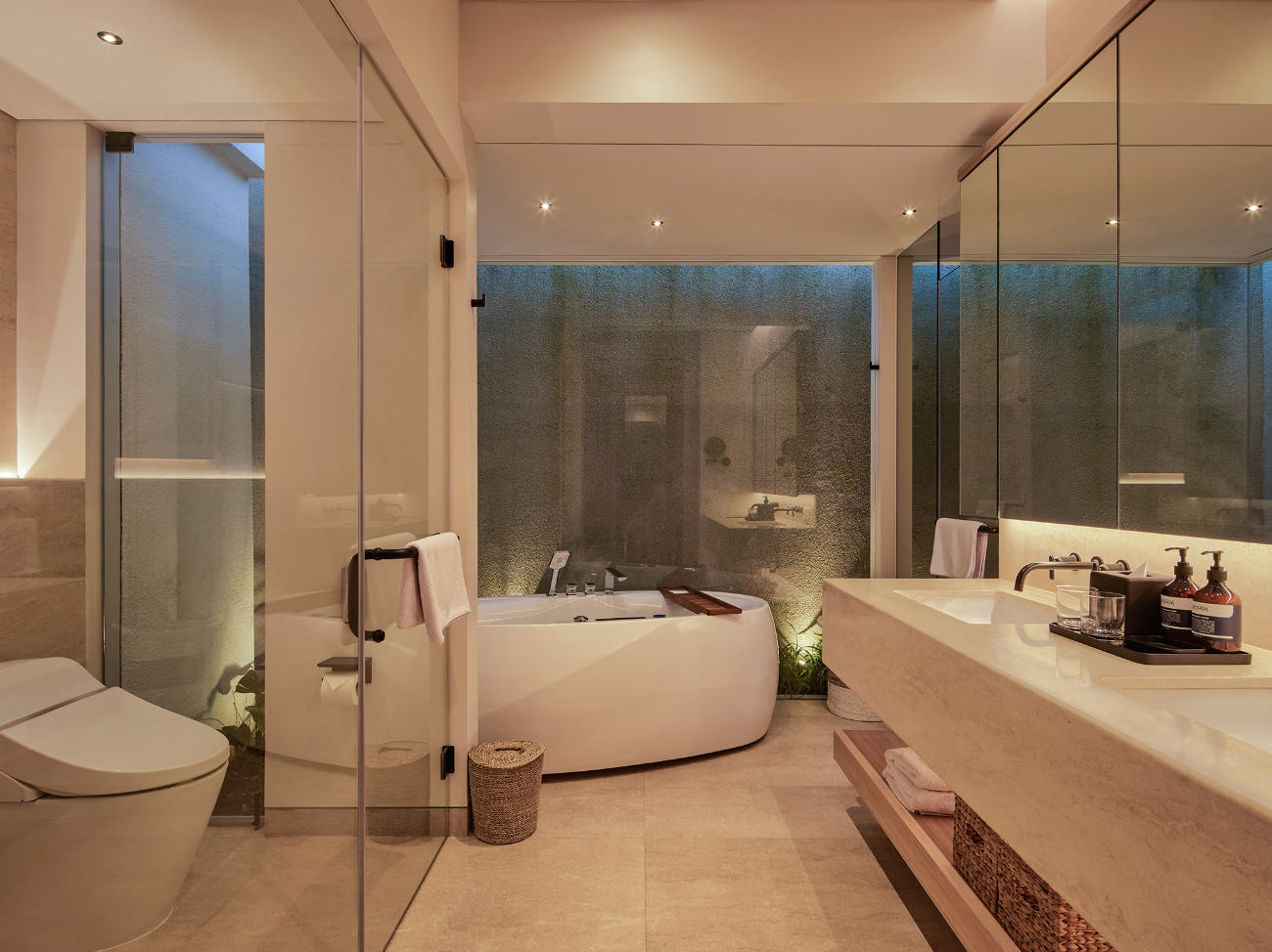Master Bedroom 2: King-sized bed; Bedside table; Hanging lamps; Study desk; Flat-screen TV; Dressing area; Closet; Safety deposit box; Airconditioning; Ensuite bathroom with USB dock for music, standalone jacuzzi, rain shower with tropical greenery and bench seating, double vanities, toilet, bidet; Toiletries; Bathrobes; Hairdryer; Towels; Slippers