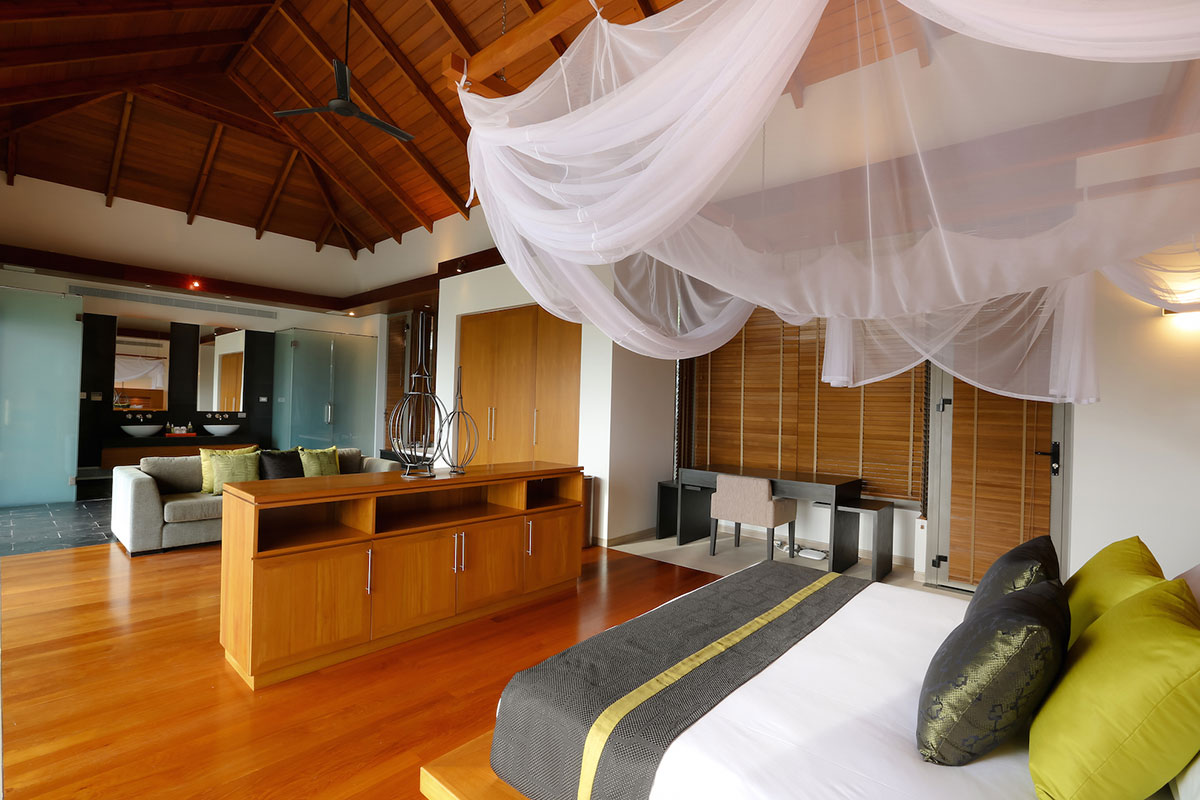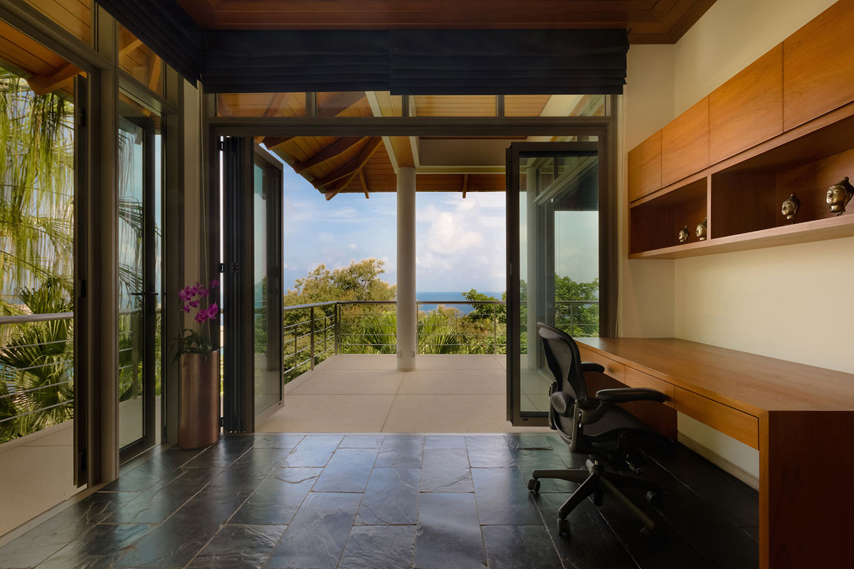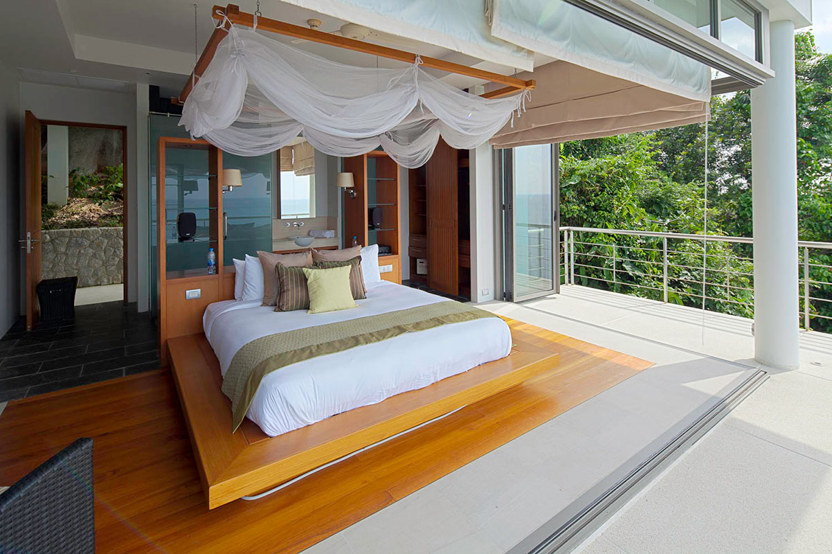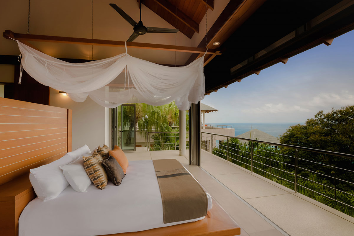 Master Bedroom 1 — Ocean view; King size bed; Sofa bed that can sleep one extra child; Walk-in closet; Safety box; Bluetooth sound system; Air conditioning; Ceiling fan; Ensuite bathroom with Bathtub, Rain shower & shower, Double vanities, separate Toilet + Outdoor Shower, and Sitting area; Ensuite office with work desk and intercom; Toiletries; Hair dryer; Bathrobes; Slippers; Umbrellas; Access to Bedroom 5 via a staircase