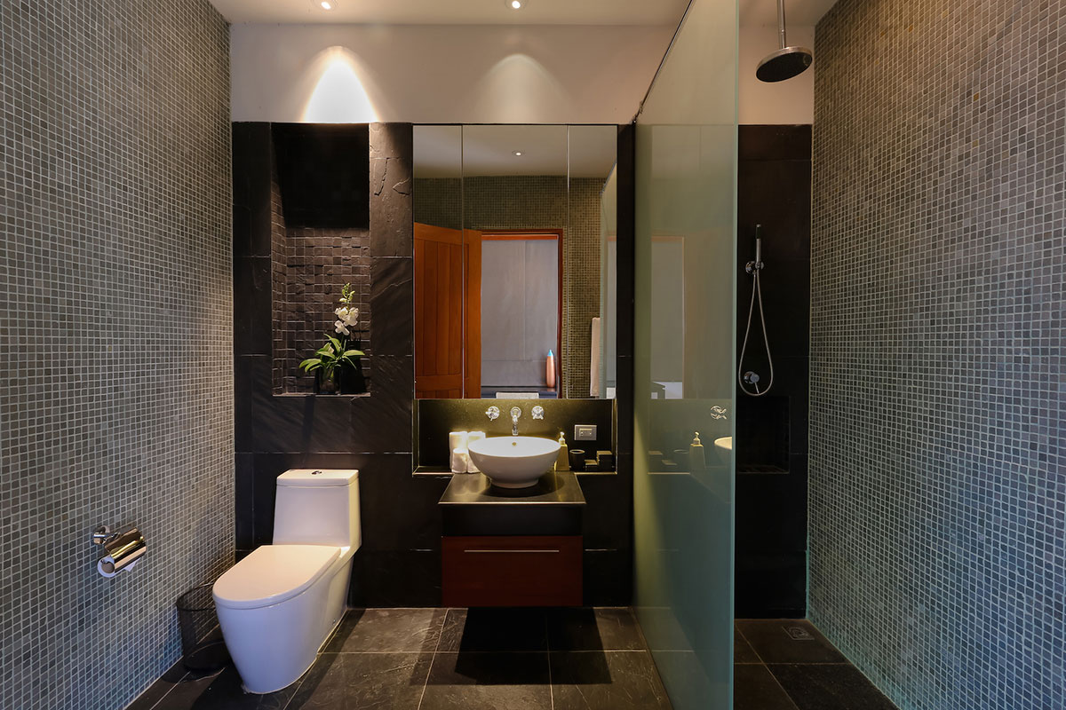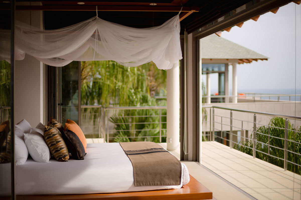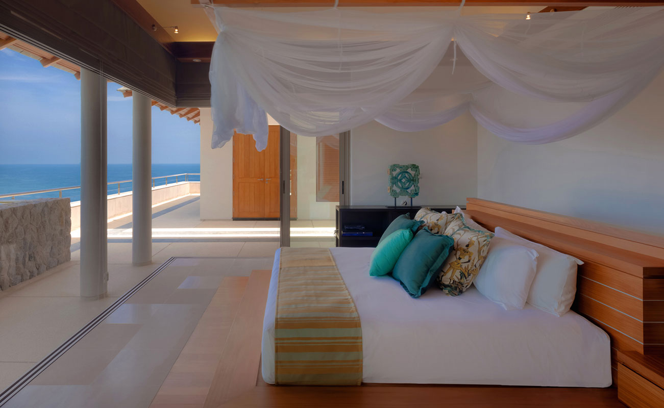 Master Bedroom 1 — Ocean view; King size bed; Sofa bed that can sleep one extra child; Walk-in closet; Safety box; Bluetooth sound system; Air conditioning; Ceiling fan; Ensuite bathroom with Bathtub, Rain shower & shower, Double vanities, separate Toilet + Outdoor Shower, and Sitting area; Ensuite office with work desk and intercom; Toiletries; Hair dryer; Bathrobes; Slippers; Umbrellas; Access to Bedroom 5 via a staircase