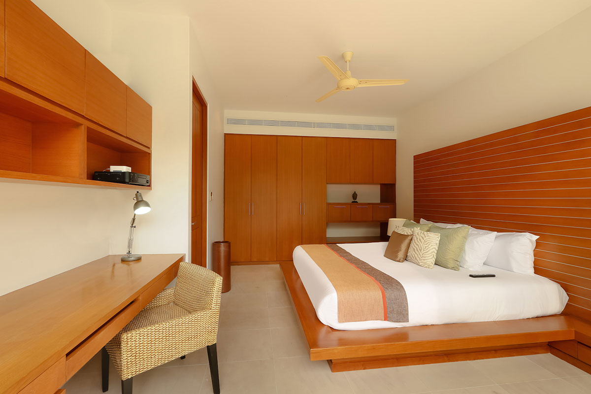 Guest Bedroom 3 — Ocean view; King size bed; Work desk; Closet; Safety box; Intercom; Air conditioning; Ceiling fan; Ensuite Rain shower & shower, One vanity, and Toilet; Toiletries; Hair dryer; Bathrobes; Slippers; Umbrellas; Easy access to living areas for elderly and kids