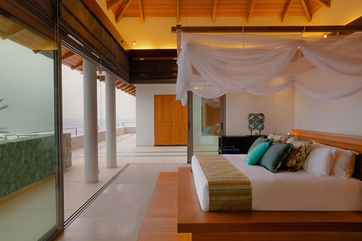 Guest Bedroom 9 — This stand‑alone ‘mini villa’ is located below the main villa via a long flight of steps; On the floor above the bedroom is a living room and fully‑equipped kitchen shared with bedroom 8; Sunset & ocean views; King size bed; Closet; Bluetooth sound system; Safety box; Intercom; Air conditioning; Ceiling fan; Ensuite bathroom with Rain shower & shower, One vanity, and Separate toilet; Toiletries; Hair dryer; Bathrobes; Slippers; Umbrellas; Balcony