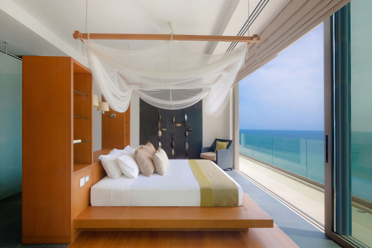 Guest Bedroom 6 — Ocean View; King size bed; Closet; Safety box; Intercom; Air conditioning; Ceiling fan; Bluetooth sound system; Ensuite bathroom with Bathtub, Rain shower & shower, One vanity, and; Separate toilet; Toiletries; Hair dryer; Bathrobes; Slippers; Umbrellas; Access to master bedroom 2 via a staircase